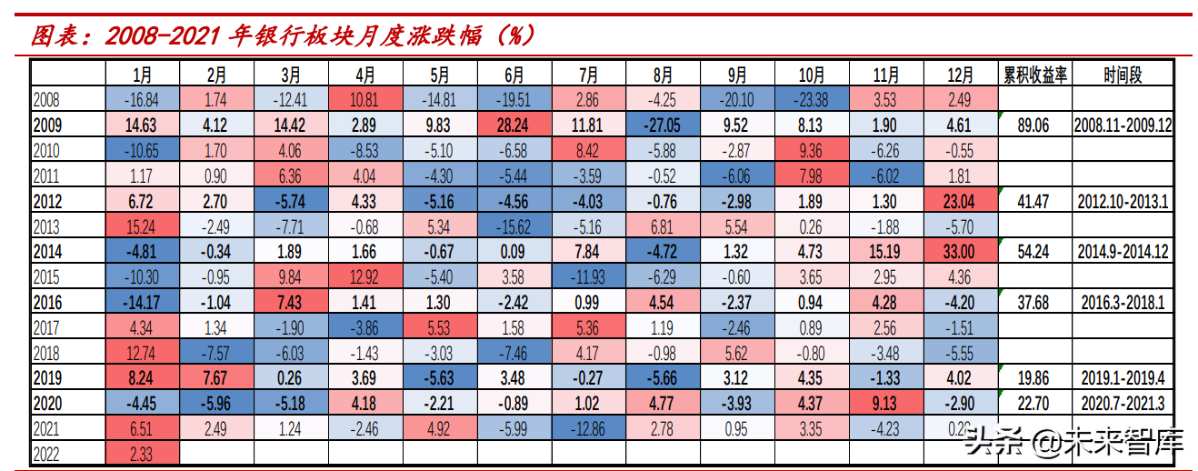 2008-2021 年这 14 年来银行板块一共录得 8 轮较大的超额收益:时间 段分布在 2008 年 6 月-2008 年 8 月、2009 年 5 月-2009 年 6 月、2011 年 8 月-2012 年 1 月、2012 年 10 月-2013 年 1 月、2014 年 10 月-2014 年 12 月、2015 年 6 月-2015 年 9 月、2018 年 6 月-2018 年 10 月以及 2020 年 8 月-2021 年 3 月,分别录得累积超额收益率 18%、21%、24%、 13%、24%、18%以及 14%,行情持续的时间分别为 3M、2M、6M、 4M、3M、4M、5M 和 8M,其中 2009 年、2012 年、2014 年以及 2020-2021 年这 4 轮板块是既有显著的绝对收益又有超额收益;2008 年、2011 年、 2015 年和 2018 年则是作为防御性板块获取了较大额的相对收益。