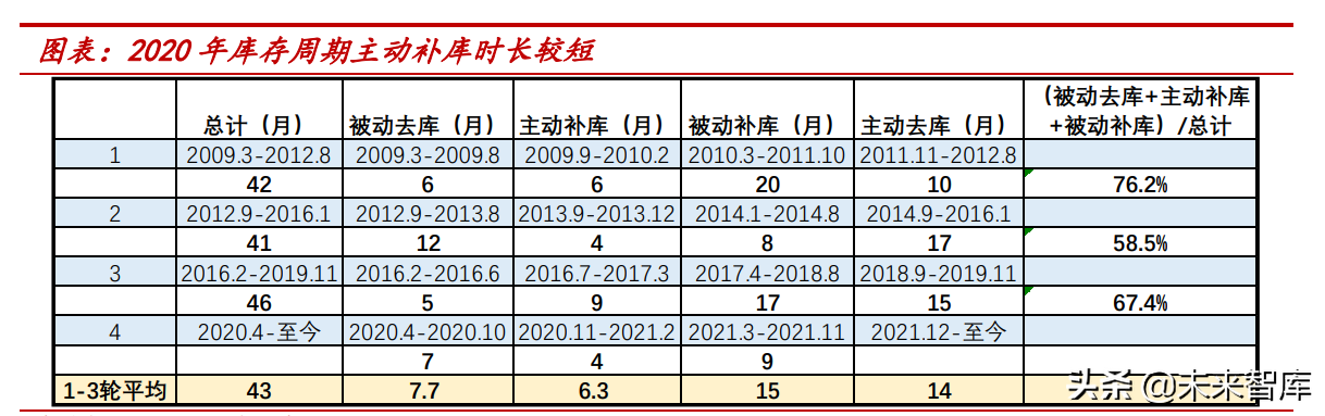 2009 年至今经历了 4 轮库存周期,前三轮平均总时长 43 个月。前三轮 库存周期的被动去库、主动补库、被动补库和主动去库平均时长为 7.7 个月、6.3 个月、15 个月和 14 个月。另由于疫情干扰原因,原本应进 入新一轮被动去库阶段的中国经济,在 2019 年 12 月至 2020 年 3 月出 现了被动库存积累,这一期间的异常数据不纳入考虑,我们新一轮的库 存周期在 2020 年 4 月开启。