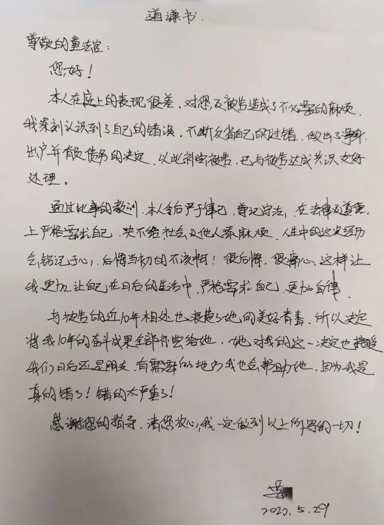 要某在道歉书中写道,通过此事的教训,本人今后严于律己,遵记(应为纪)守法,在法律及道德上严格要求自己,决不给社会及他人添麻烦。人生中的这次经历会铭记于心,后悔当初的不该啊!很后悔,很痛心,这样让我更加让自己在日后的生活中严格要求自己,更加自律。与被告的近10年相处,也浪费了她的美好青春,所以决定将我10年的奋斗成果全部补偿给她。她对我的这一决定也接受,我们日后还是朋友,有需要的地方,我也会帮助她,因为我是真的错了!错的太严重了!感谢您的指导,请您放心,我一定做到以上所写的一切!