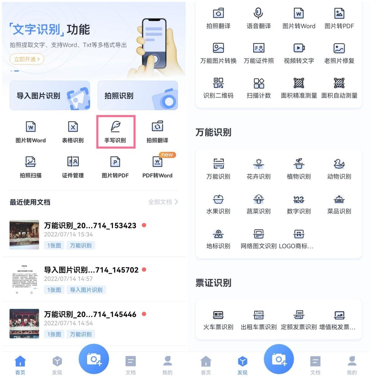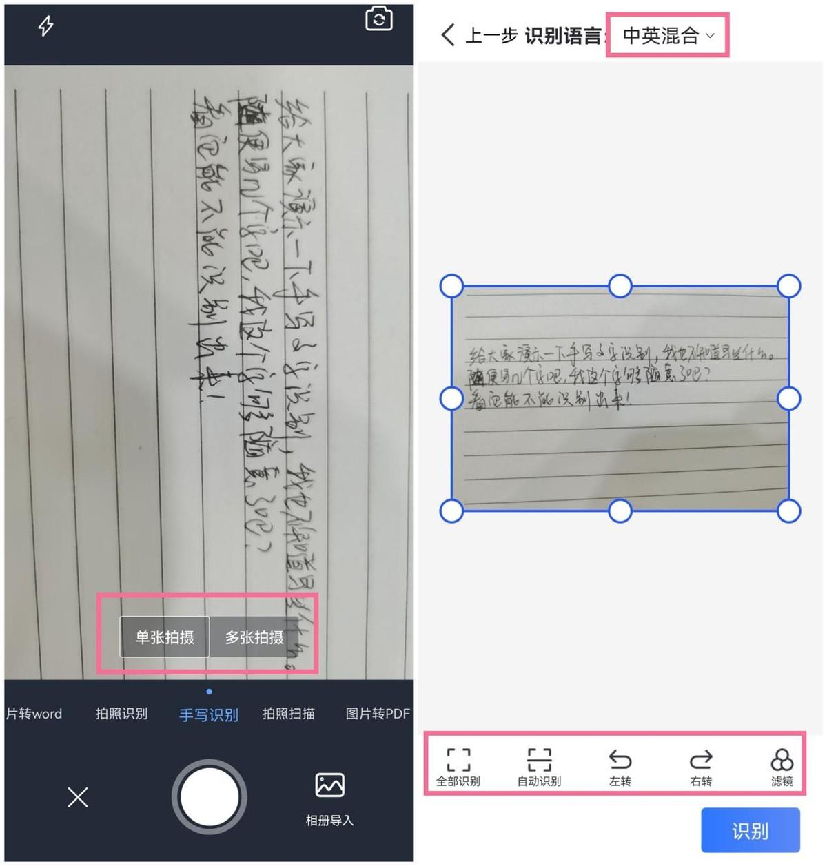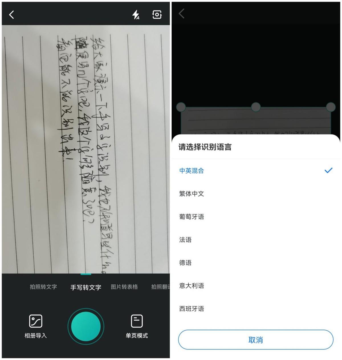 识别手写文字直接点击首页的[手写识别]就可以啦,点击之后就可以直接拍照了,也可以上传图片识别,还可以多张拍摄;