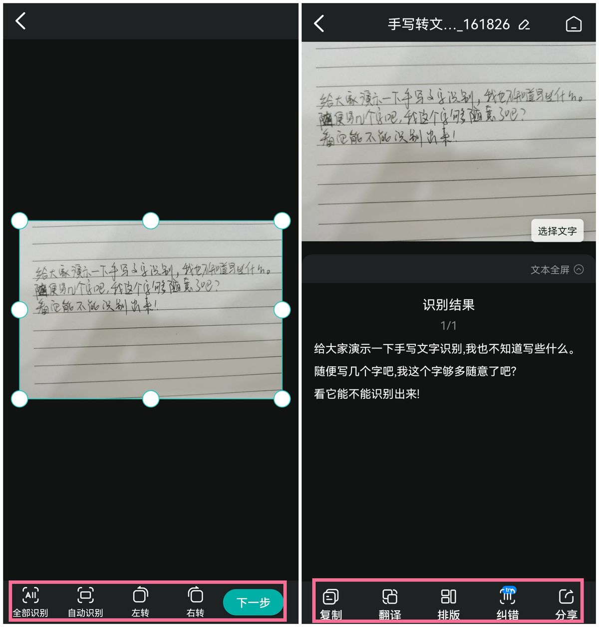 需要识别手写文字,直接点击手写转文字即可,点开就可以直接拍摄你手写的文字了,也可以直接上传拍摄好的照片进行识别,拍摄好之后你可以调整照片中需要识别的范围,并且选择需要识别的语言;
