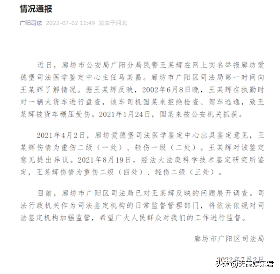 唐山打人事件已经过去20多天,热度逐渐消退,官方的最新通报日期仍旧停留在6月21日,十多天来尚未有新的通报和进展。然而,近日社交媒体平台流传一则自称廊坊市广阳分局民警实名举报的视频窜上热搜,引起广大网友的广发关注。视频中一名民警称:我是廊坊市公安局广阳分局民警王某辉,我现在实名举报廊坊市爱德堡司法鉴定中心主任法医马某昌,罔顾事实,篡改结果,违法鉴定,我将及时地,如实地提交所有证据。