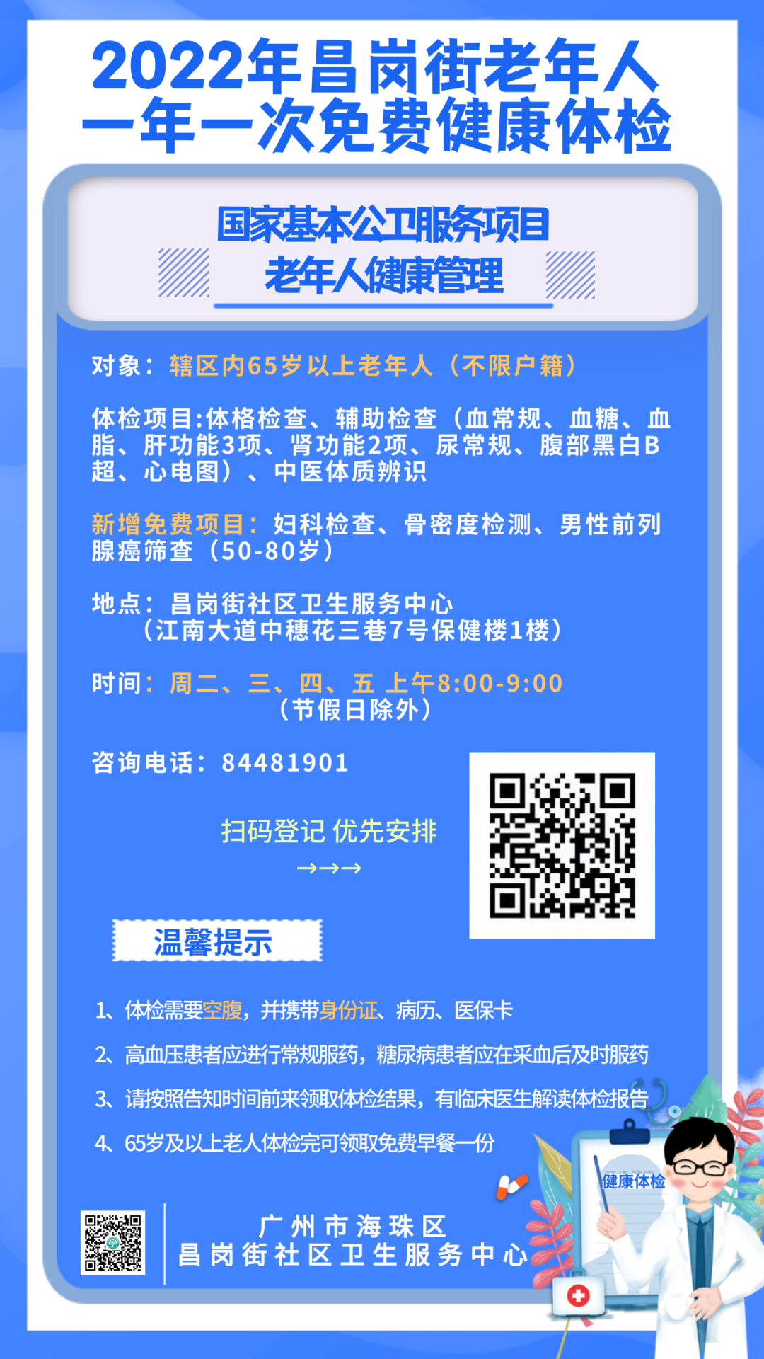 海珠区新港街社区卫生服务中心东晓南门诊(东晓南路77号二楼健康小屋):每周三、周五上午8:00-9:30,节假日除外。海珠区新港街社区卫生服务中心美景门诊(新港西路德华街5号):每周四上午8:00-9:30,节假日除外。海珠区新港街怡凤社区卫生服务站(海珠区怡乐路怡正街15号):2月22日开始每周二上午8:00-9:30,节假日除外。体检要求: