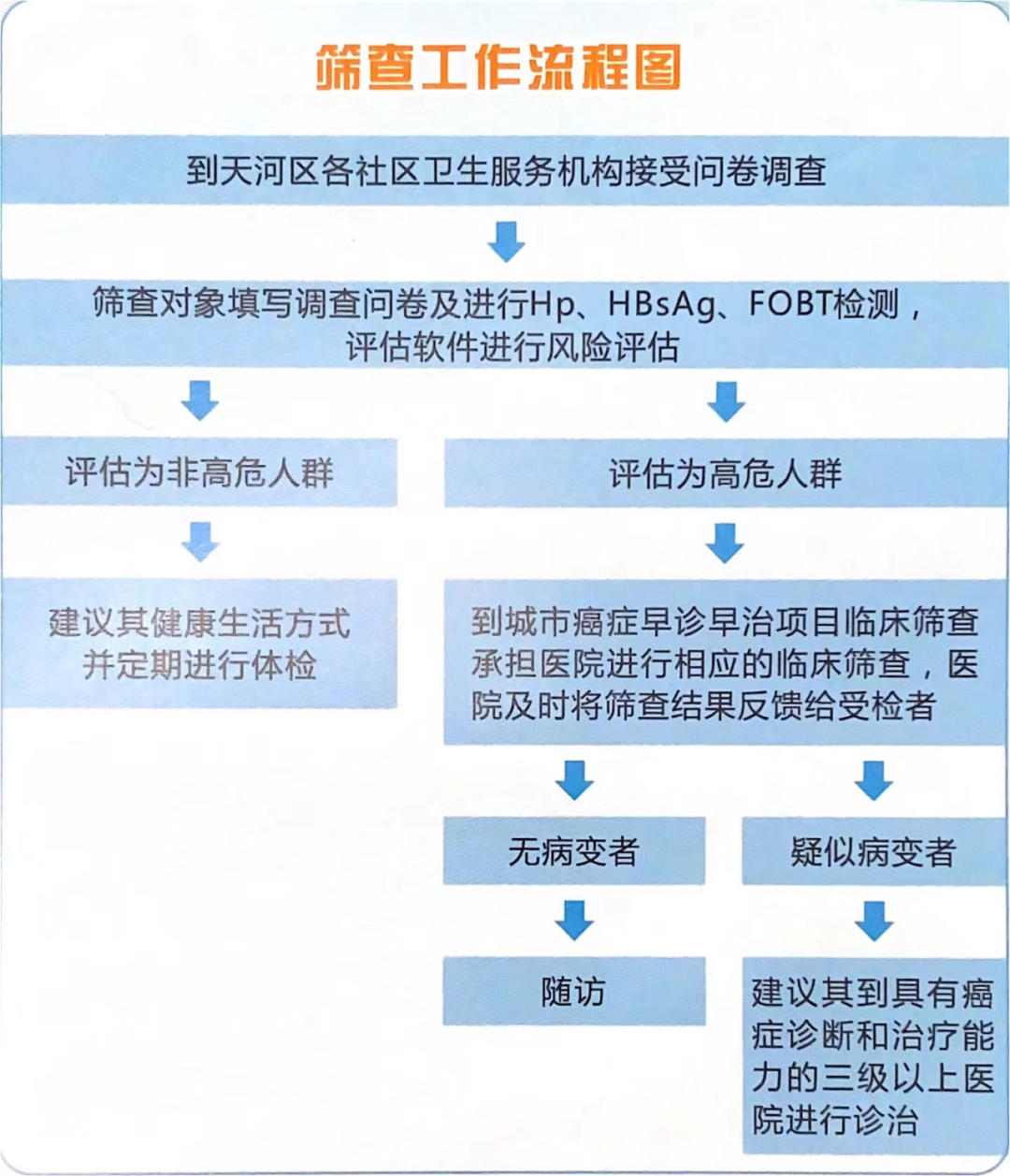 携带身份证前来一楼健康管理家园进行筛查(完成问卷、大便潜血、HP及测HBsAg)。经初筛后,系统分析为高危人群者,有专人电话通知本人去上级医院进行相关免费检查(如抽血、胃镜、CT、肠镜、B超、钼靶等)。咨询电话:84354400