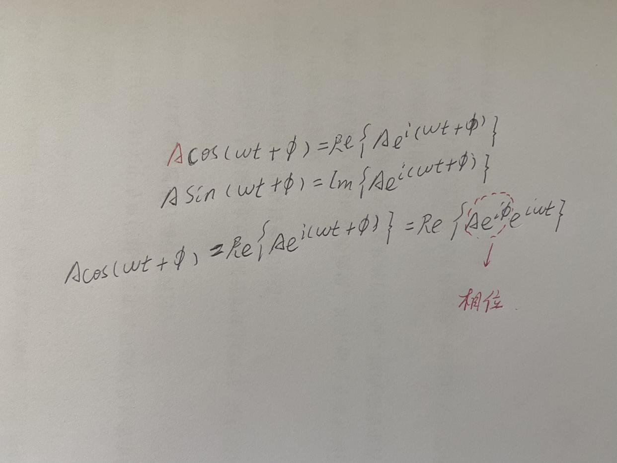 此外,如果我们处理的是一个所有振荡频率相同的系统,我们可以将欧拉公式得到的指数分成两半,在代数运算中不考虑频率部分。因此,在这种情况下,只需要一个单一的复数,即相量,就可以完全描述我们系统中的每个正弦波。