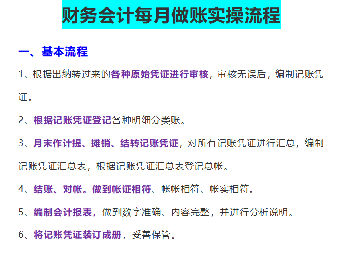 今天就把这份财务会计每月做账实操流程分享给大家,新手会计没有师傅带,那就打印出来,自己好好学习一下!最后希望能在工作上给大家一点帮助~~~