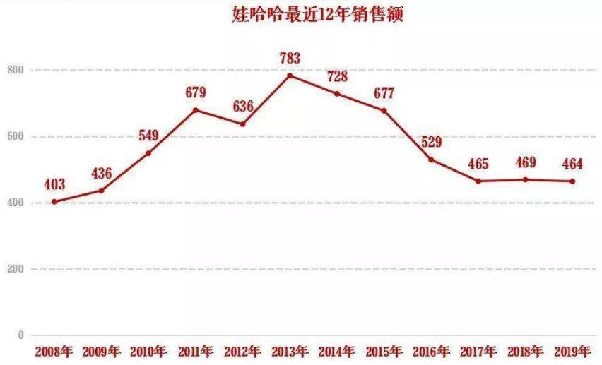 从业绩来看,2013年娃哈哈销售额达到783亿元的顶峰之后,业绩一路下滑至2019年的464亿元。虽然这个体量仍然十分庞大,仍然是食品饮料行业的一艘巨舰航母,但所有人都能看得出来娃哈哈的疲态。