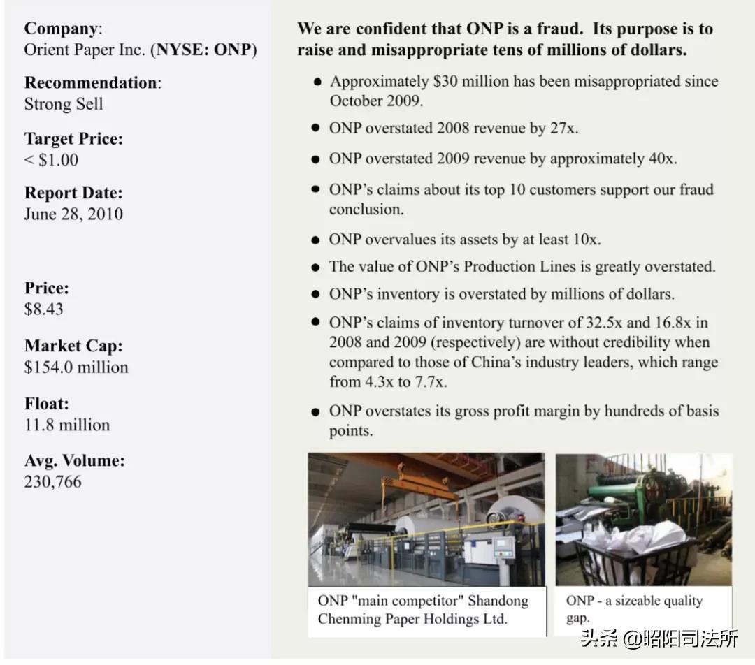 东方纸业从2009年起,挪用超过3000万美元的资金;东方纸业夸大2008年的收入达到27倍;东方纸业夸大2009年的收入达到40倍;东方纸业夸大资产达到10倍。相比以往的各类调查,浑水公司对投资者最有冲击力的就是后来屡试不爽的现场调查,在针对东方纸业的报告中,浑水公司也展现了很多这样的调查,报告展示了东方纸业陈旧的生产线、烟雾缭绕的车间、像垃圾堆一样的原料,相比于浑水展示的数据,这些现场调查的情况对于美国的投资者可能更加具有冲击力。
