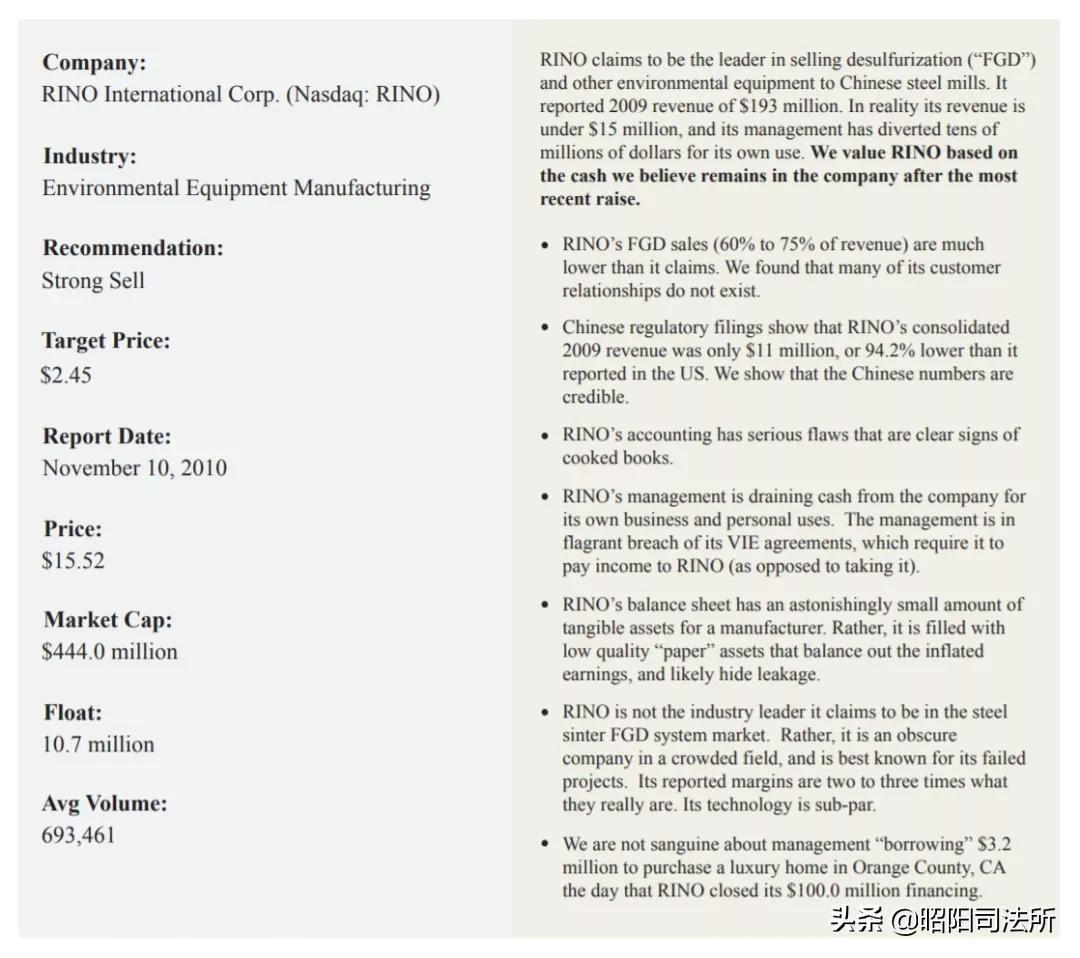 在这篇报告中,浑水公司对于绿诺科技的评级依然是“强烈卖出”,股票目标价为2.45美元(当时股价为15.52美元),主要内容包括: