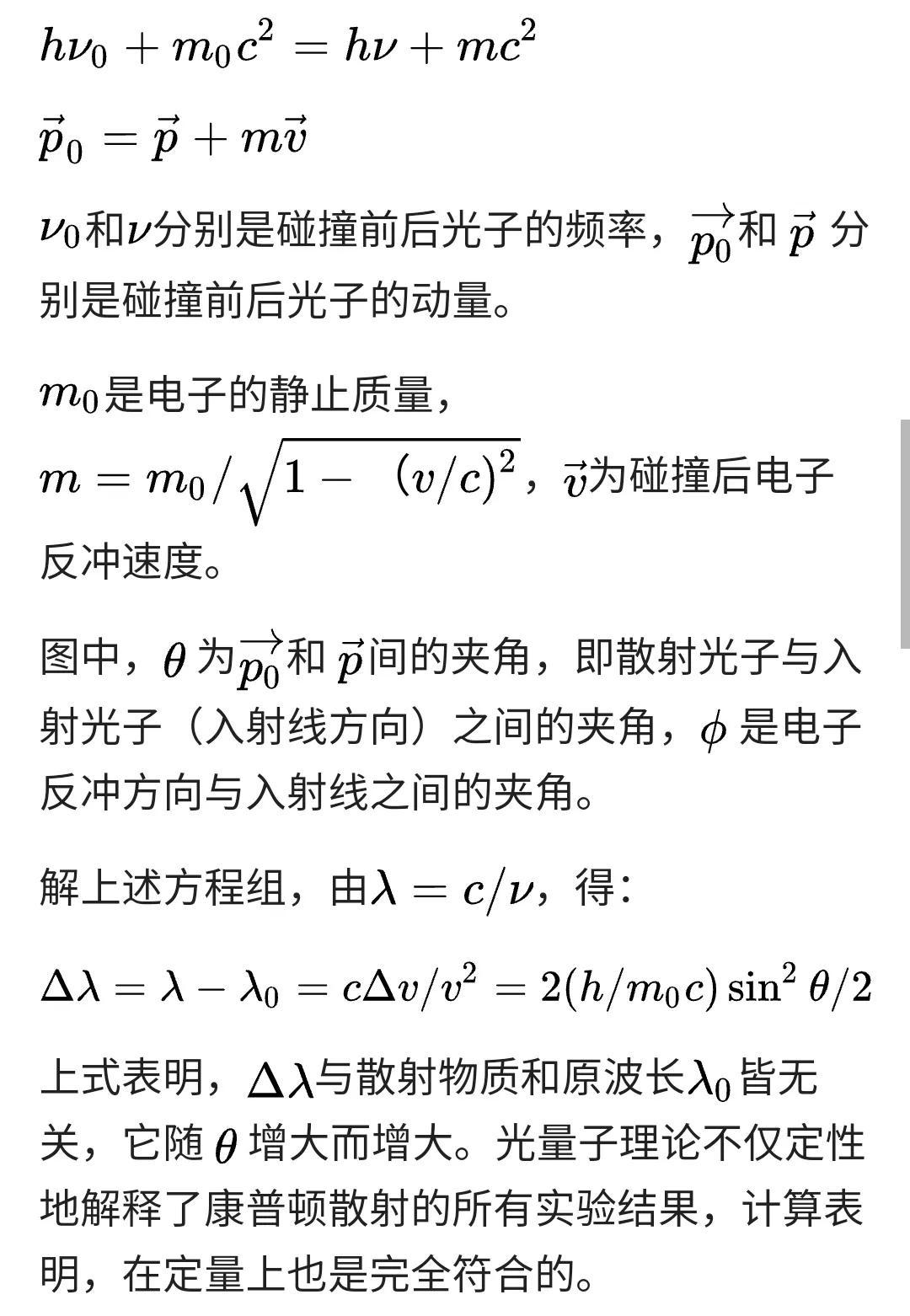 首先,我们把散射原子中的电子看成自由且静止的。康普顿散射可看做是X射线中的光子和自由电子见的弹性碰撞过程。此过程中能量和动量守恒方程(相对论形式)