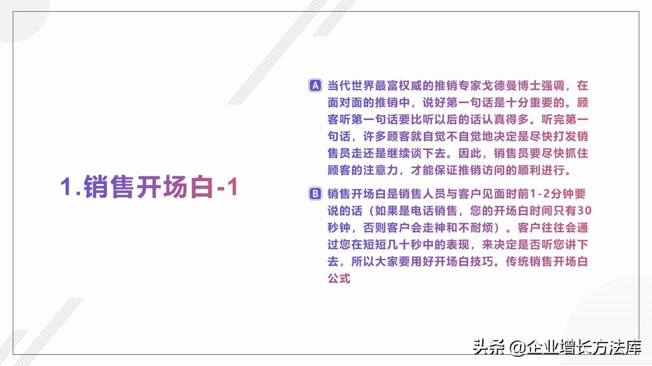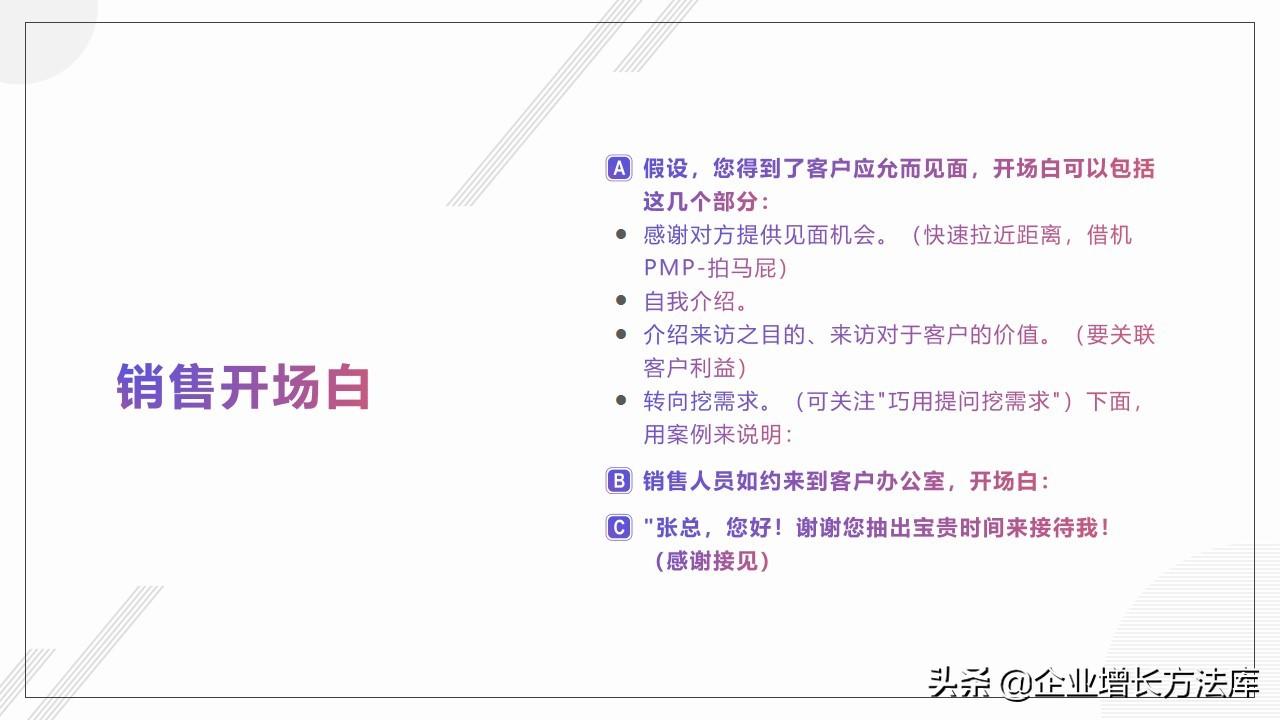 版权声明:我们致力于保护作者版权,注重分享,被刊用文章【销售开场白话术案例(干货)】因无法核实真实出处,未能及时与作者取得联系,或有版权异议的,请联系管理员,我们会立即处理! 部分文章是来自自研大数据AI进行生成,内容摘自(百度百科,百度知道,头条百科,中国民法典,刑法,牛津词典,新华词典,汉语词典,国家院校,科普平台)等数据,内容仅供学习参考,不准确地方联系删除处理!;