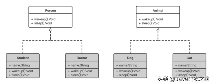 public class Student implements Person{ private String name; public Student() { } public Student(String name) { this.name = name; } @Override public void wakeup() { System.out.println(StrUtil.format("学生[{}]早晨醒来啦",name)); } @Override public void sleep() { System.out.println(StrUtil.format("学生[{}]晚上睡觉啦",name)); }}假设我们现在要做一件事,就是在所有的实现类调用wakeup()前增加一行输出早安~,调用sleep()前增加一行输出晚安~。那我们只需要编写2个代理类PersonProxy和AnimalProxy: