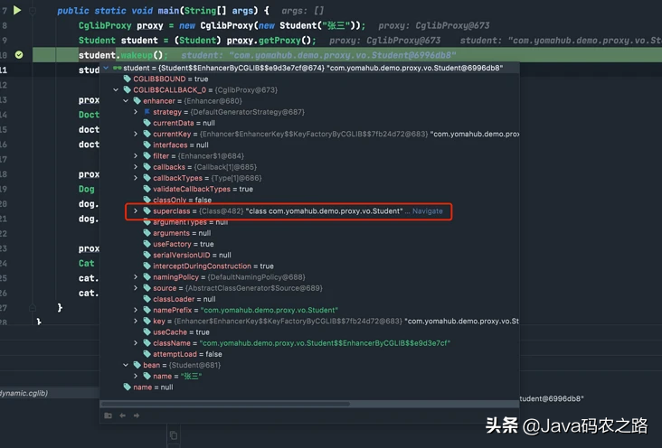 public static void main(String[] args) { CglibProxy proxy = new CglibProxy(new Student("张三")); Student student = (Student) proxy.getProxy(); student.wakeup(); student.sleep(); proxy = new CglibProxy(new Doctor("王教授")); Doctor doctor = (Doctor) proxy.getProxy(); doctor.wakeup(); doctor.sleep(); proxy = new CglibProxy(new Dog("旺旺")); Dog dog = (Dog) proxy.getProxy(); dog.wakeup(); dog.sleep(); proxy = new CglibProxy(new Cat("咪咪")); Cat cat = (Cat) proxy.getProxy(); cat.wakeup(); cat.sleep();}讲解: