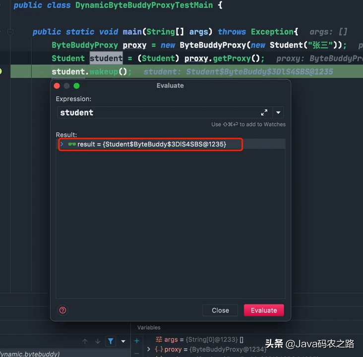 public static void main(String[] args) throws Exception{ ByteBuddyProxy proxy = new ByteBuddyProxy(new Student("张三")); Student student = (Student) proxy.getProxy(); student.wakeup(); student.sleep(); proxy = new ByteBuddyProxy(new Doctor("王教授")); Doctor doctor = (Doctor) proxy.getProxy(); doctor.wakeup(); doctor.sleep(); proxy = new ByteBuddyProxy(new Dog("旺旺")); Dog dog = (Dog) proxy.getProxy(); dog.wakeup(); dog.sleep(); proxy = new ByteBuddyProxy(new Cat("咪咪")); Cat cat = (Cat) proxy.getProxy(); cat.wakeup(); cat.sleep();}讲解: