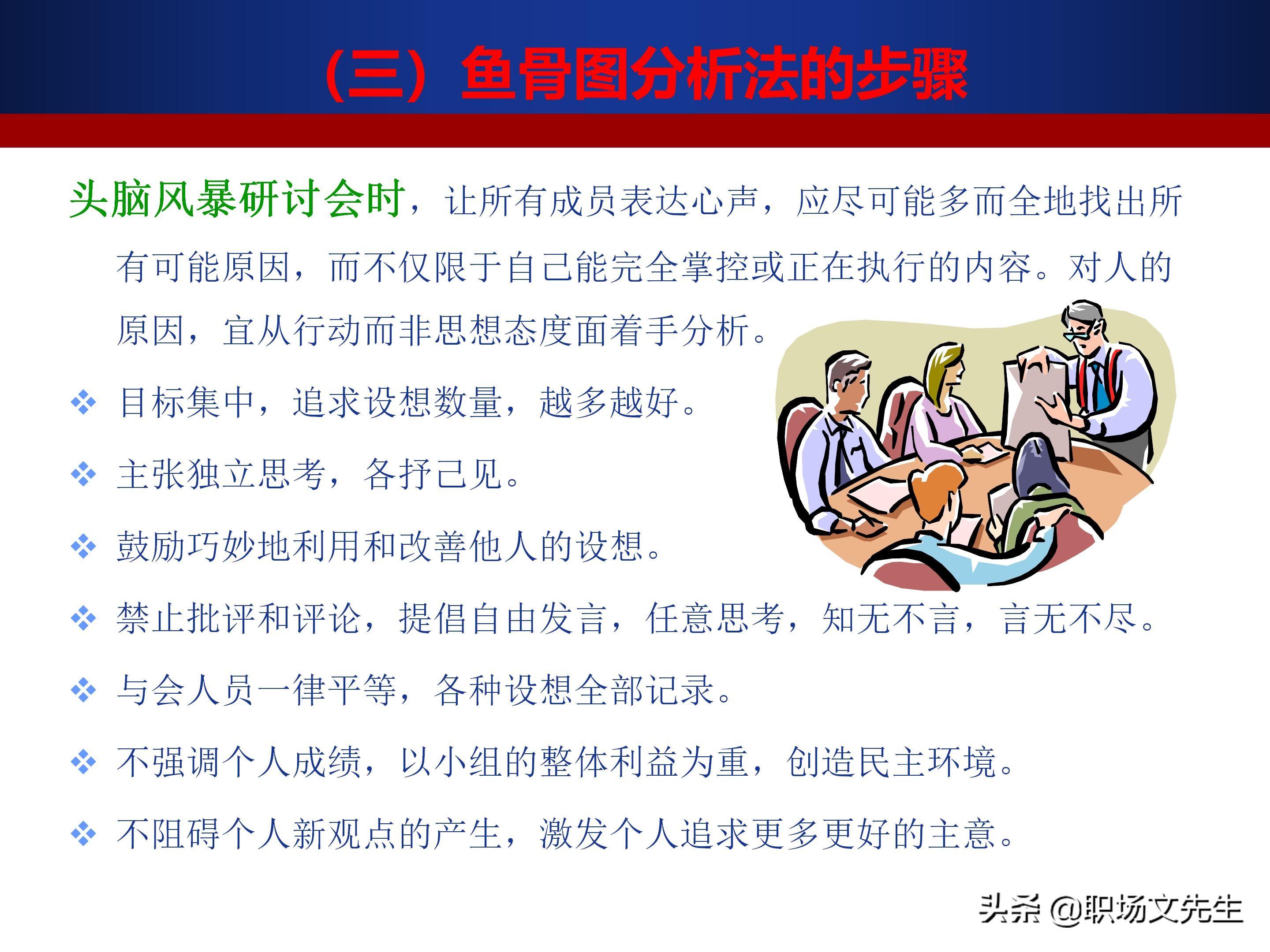 头脑风暴研讨会时,让所有成员表达心声,应尽可能多而全地找出所有可能原因,而不仅限于自己能完全掌控或正在执行的内容。对人的原因,宜从行动而非思想态度面着手分析。