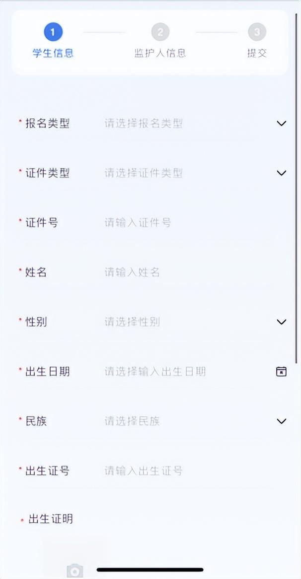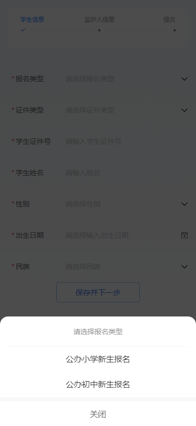 如图所示,标记红色*的内容为必填项。选择报名类型和证件类型后,若证件为身份证,系统将根据学生身份证匹配姓名、性别、出生日期,点击下一步进行监护人信息填写。
