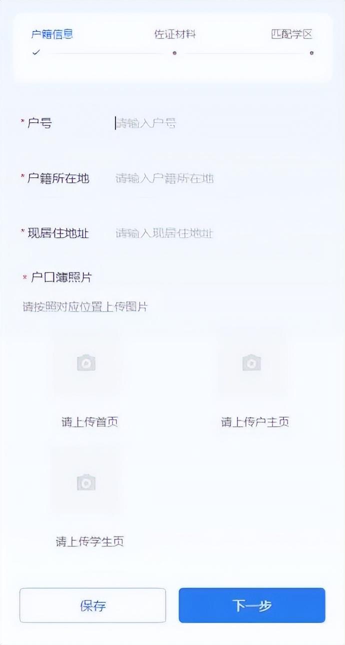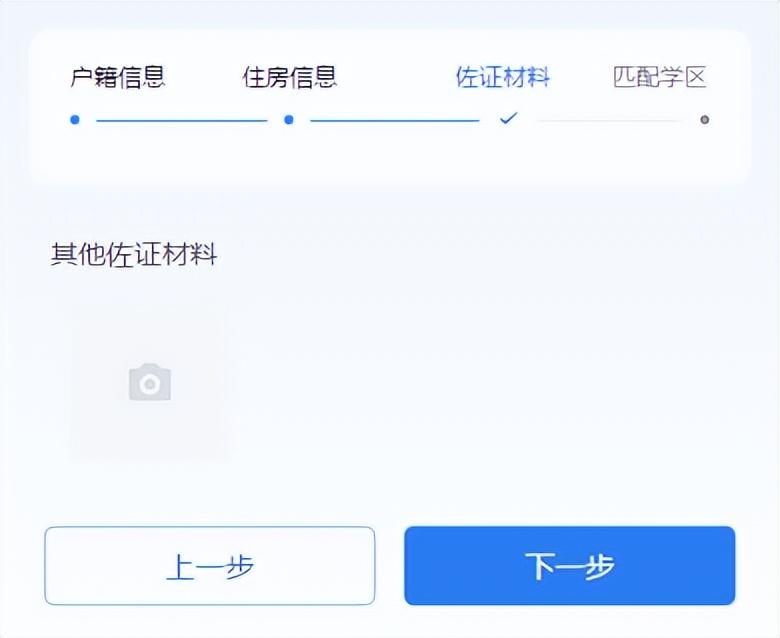 如图所示,若标有红色*的内容为必填项。准确填写报名类型需要的佐证材料并上传房产证明后,点击下一步,进入学区选择页面。
