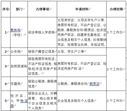 2.教育部门对网上申请入学对象是否符合本学区入学条件进行审核,再将相关信息分别推送至公安局、自然资源局、住建局、人社局、市场监督管理局、经开区、九甲物流园区等联办部门核验;公安部门核验户籍登记信息(学生及父母姓名和身份证号码、学生与户主关系、学生户籍地址),并及时反馈核验结果;自然资源部门核验房屋所有权证、不动产权证信息(房屋所有权人或不动产权人姓名、房屋所有权证或不动产证编号、房屋或不动产坐落地址、规划用途),核验经济适用房产权证信息,并及时反馈核验结果;住建部门核验公租房、廉租房信息(承租人姓名、身份证号码),并及时反馈核验结果;经开区、九甲物流园区核验企业法人、外聘髙管、核心技术骨干企业信息及相关个人信息,并及时反馈核验结果;人社局核验进城务工人员社保缴纳信息,并及时反馈核验结果;市场监督管理局核验经商营业执照、年报证明信息,并及时反馈核验结果;根据各业务主管部门审核情况,将存在疑似虚假材料或填写错误反馈其家长,并由家长再次提供相关材料或说明情况,再次提交审核。