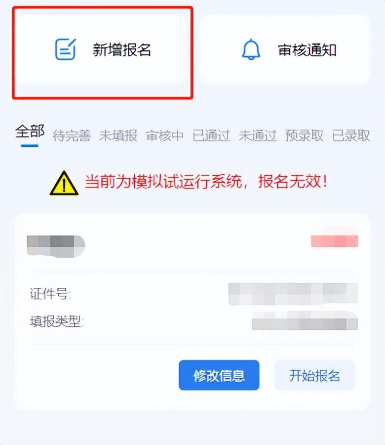点击报名首页“开始报名”按钮,进入我的报名页面,可看到“新增报名”。