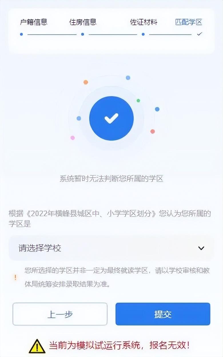根据《根据2022年横峰县城区中、小学学区划分》结合报名信息,选择就读学区,并提交。注意:您所选择的学区并非一定为最终就读学区,请以学校审核和教体局统筹安排录取结果为准。