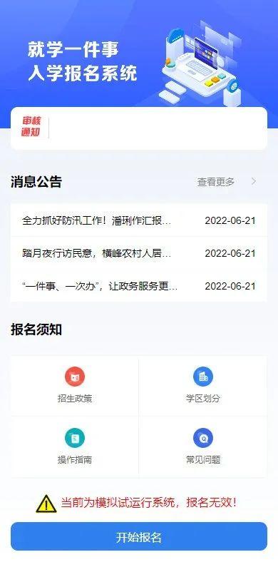 就学地区选择“横峰县”即可进入就学一件事报名首页。用户进入报名首页后可查看本年招生政策、学区划分、操作指南、常见问题、消息公告、审核通知等内容。