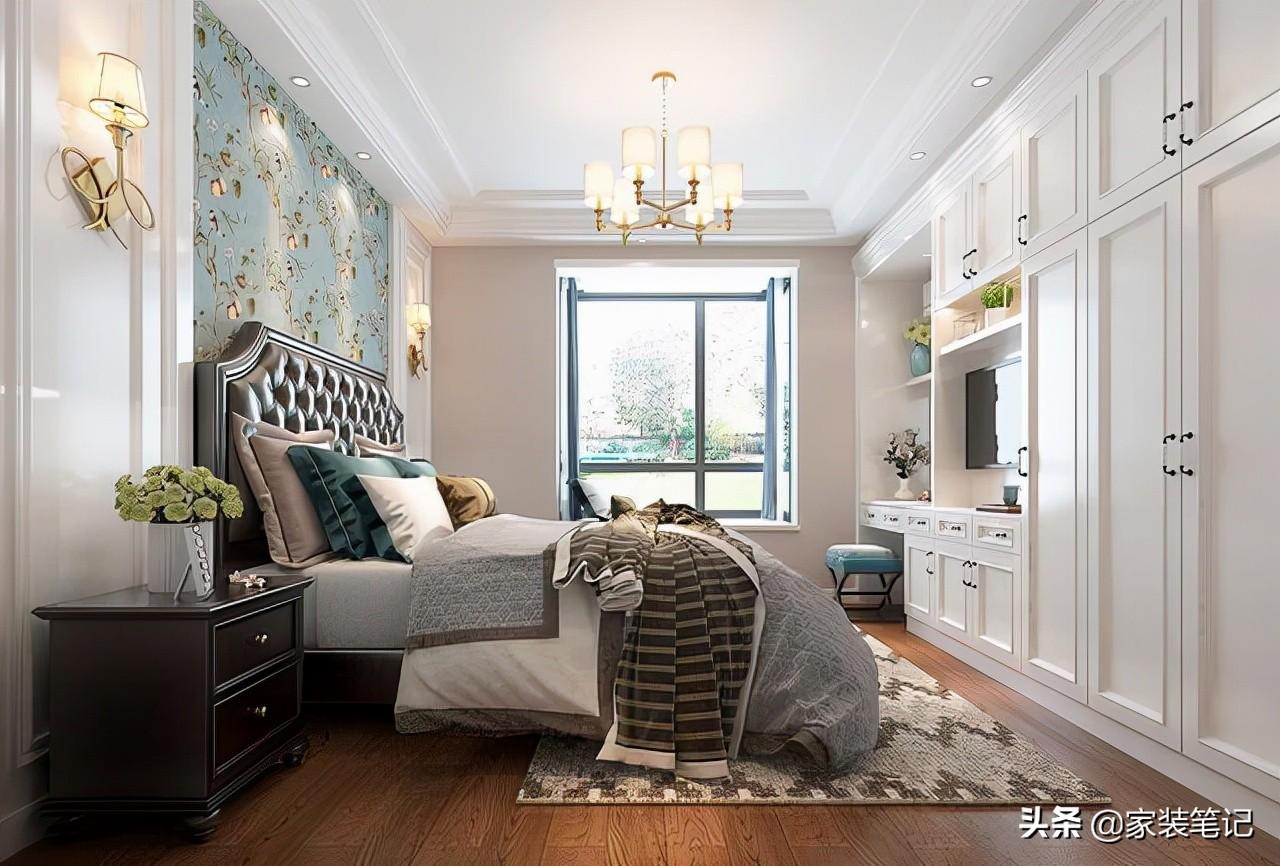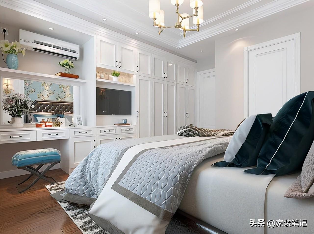 主卧室收纳功能强大,主要体现在床尾一组大衣柜上,衣柜还预算了部分地方出来做梳妆桌,中间嵌入电视机,还预留了一个格子出来,把主卧室的挂机藏在里面。色调上大面积偏米黄色,在美式风格中运用这种色彩,能够让空间显得更加温馨,尤其是在卧室里面,给人很好的安全感。