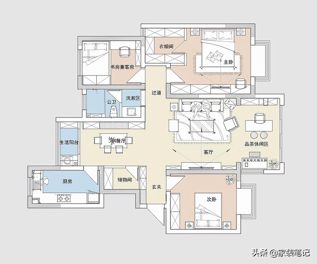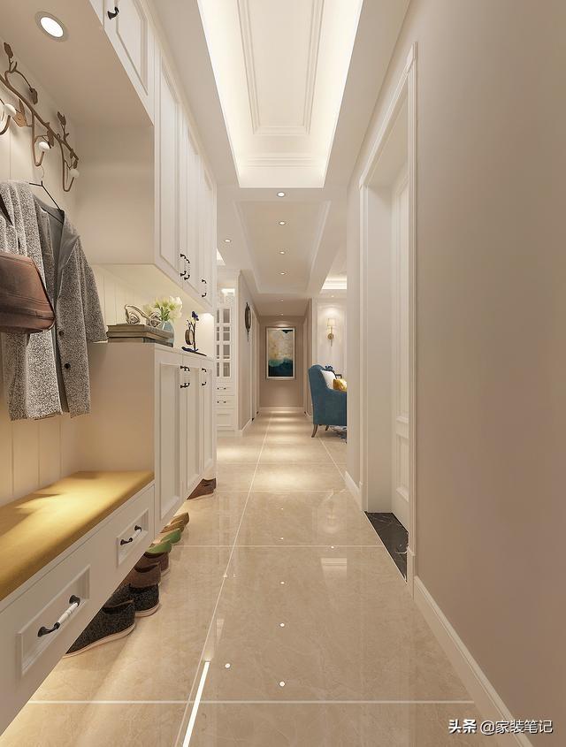 1,延伸入户玄关和电视墙平齐,在旁边做一个储物间出来,让房子结构更加的方正。
