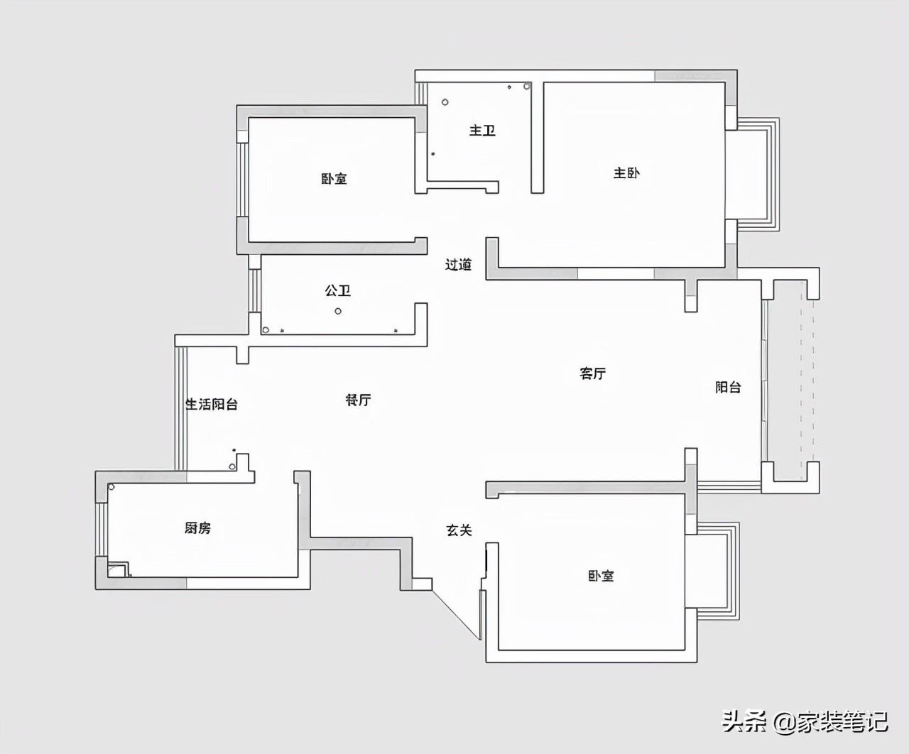 户型大致来说还是比较周正,一起是三房的格局,入户玄关太小旁边还有个区域“缺了个角”,放入户的这一块儿户型不是很完整,客厅旁边阳台外面有一个标记虚线的区域是可以拓展出去的,相当于这个阳台空间很大了。两个阳台和客餐厅在同一直线上,形成了很好的南北通透的朝向。