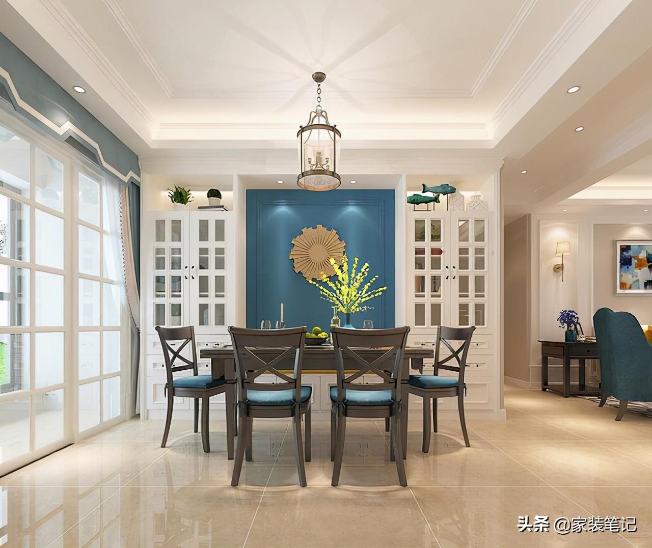 为了让空间更加的方正,在餐厅旁边隔了一个储物间出来,所以餐厅的面积就比较紧凑了,选择以卡座的形式,再好不过了,这样酒柜也有了,也能满足同时六个人一起用餐。在卡座墙面上用了蓝色做点缀,上面还悬挂了“太阳镜”装饰品,提高餐厅空间的品质效果,对面的墙面为了不显得寡淡,挂了一幅画。