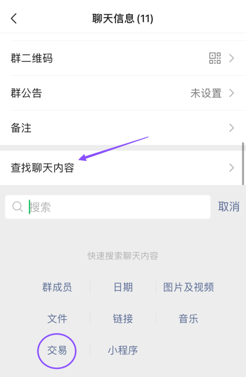 在聊天群里从右上角进入群菜单,选择“查找聊天记录”,点击“交易”,可以看到群里没有被领完的红包。