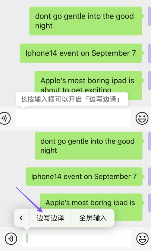 在聊天对话中输入三句英文,或者其它语言文字,微信会提醒开启“边写边译”功能,长按输入框开启,那么只要打出中文就可以实现英文聊天(或者其它语言文字)。