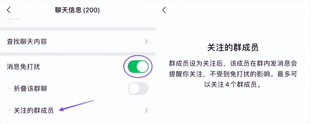 群成员设为关注后,该成员在群内发消息会提醒你关注,不受到免打扰的影响。最多可以关注4个群成员。