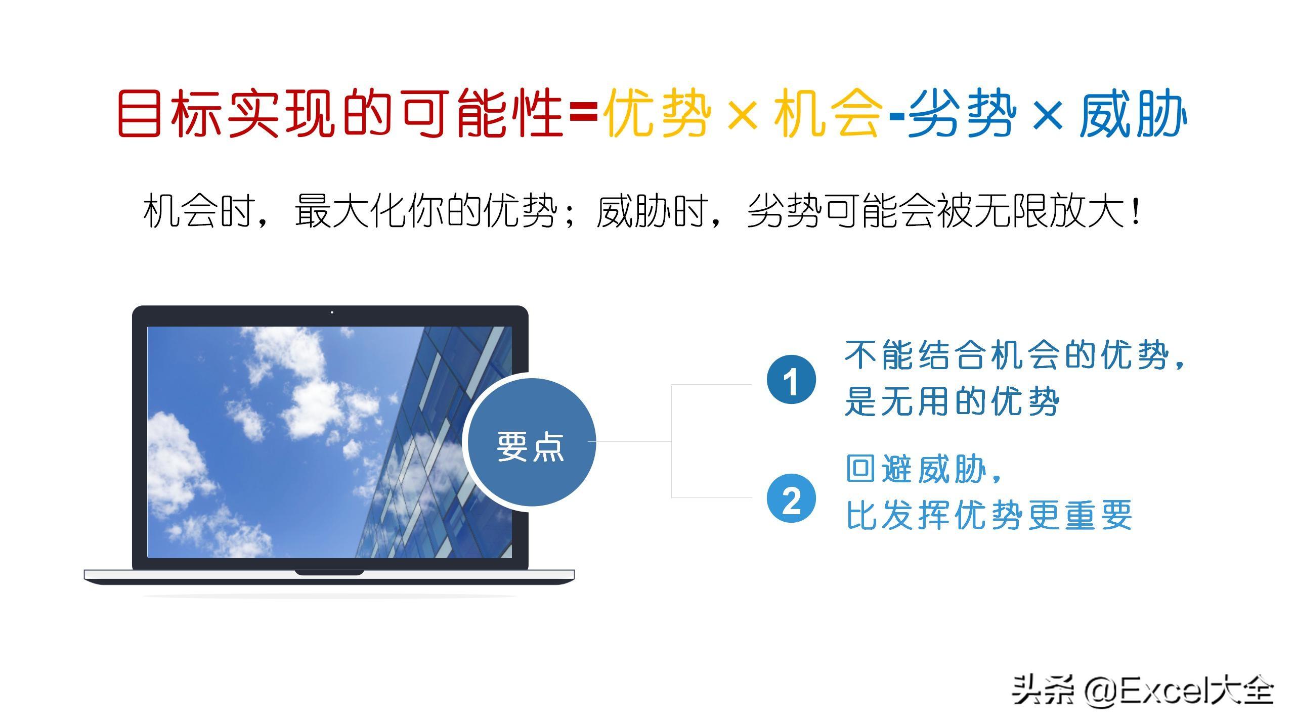 目标实现的可能性=优势×机会-劣势×威胁 回避威胁,比发挥优势更重要 不能结合机会的优势,是无用的优势五、总结