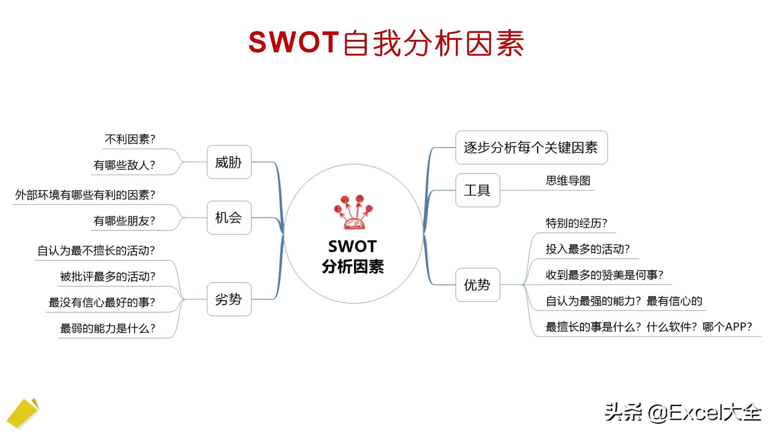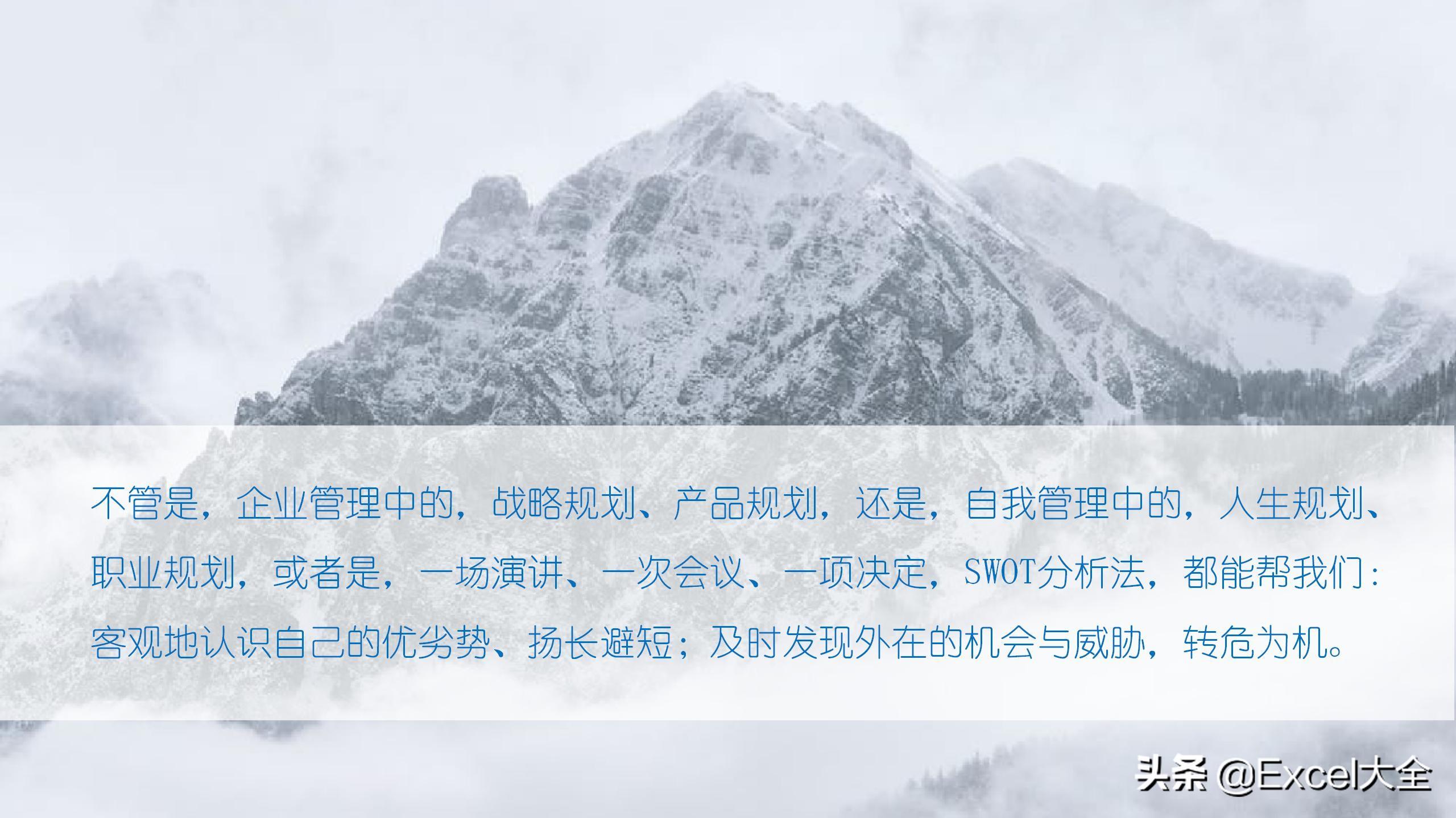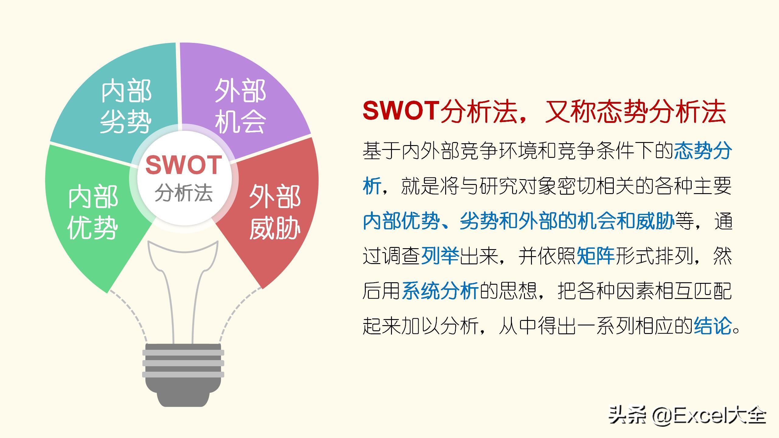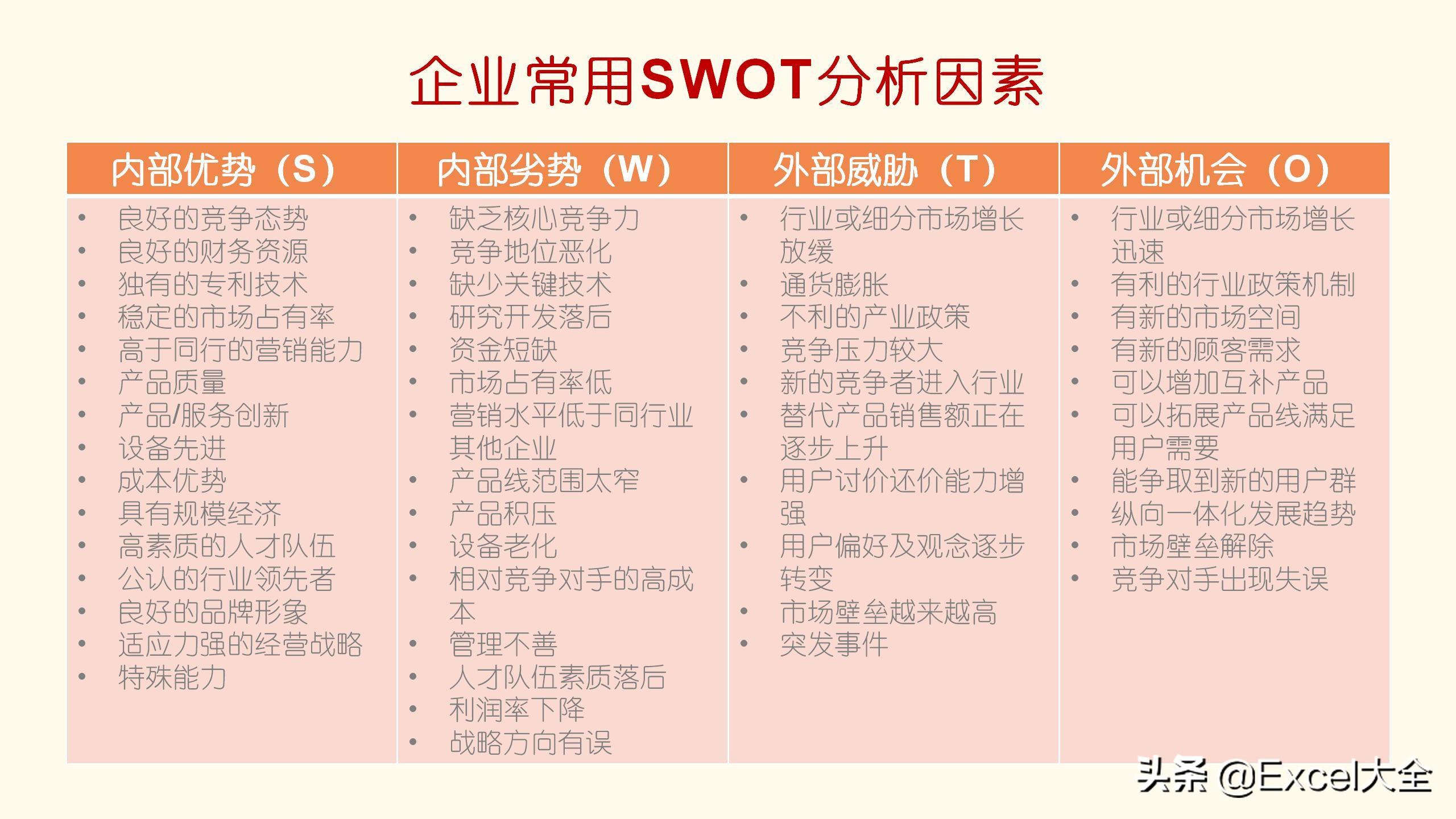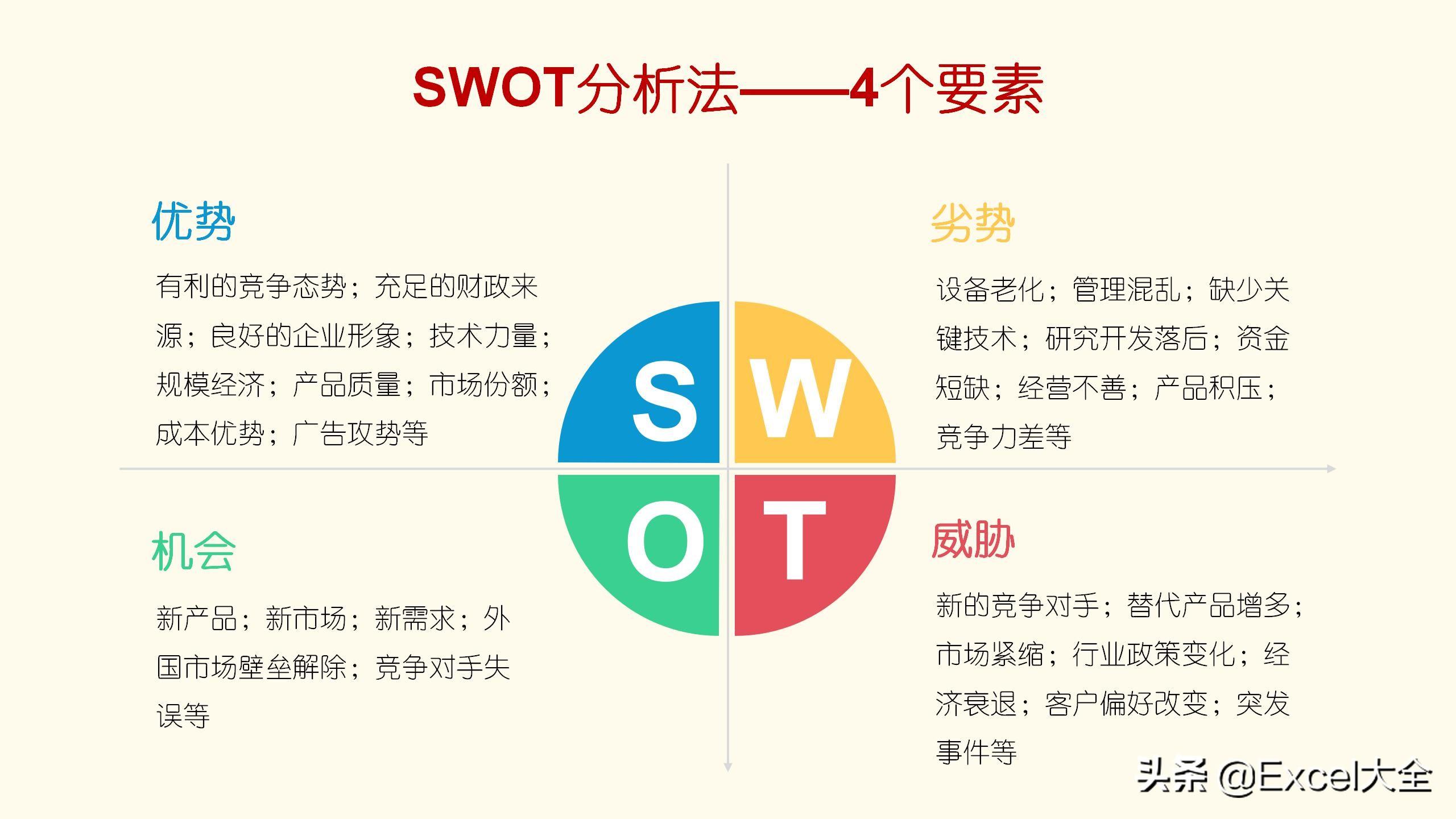 企业战略规划、产品规划、个人的人生规划、职业规划,甚至是,一场演讲、一次会议、一项决定,都用得到SWOT分析。