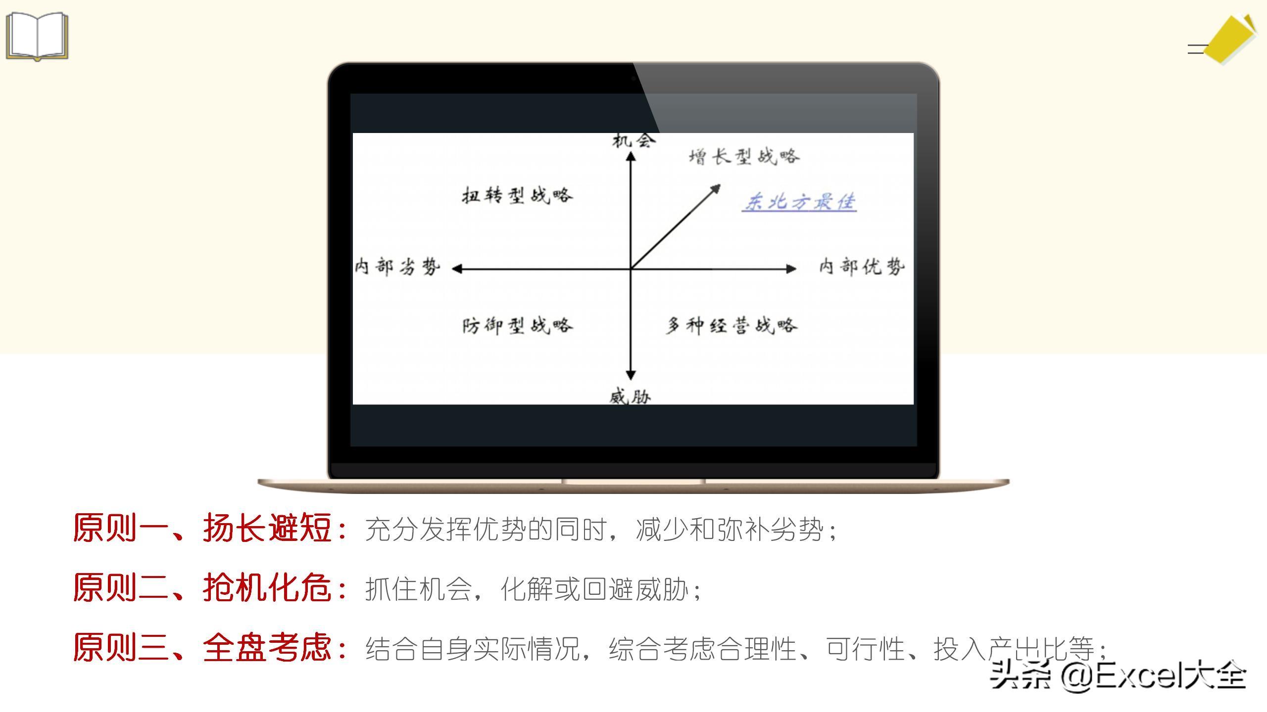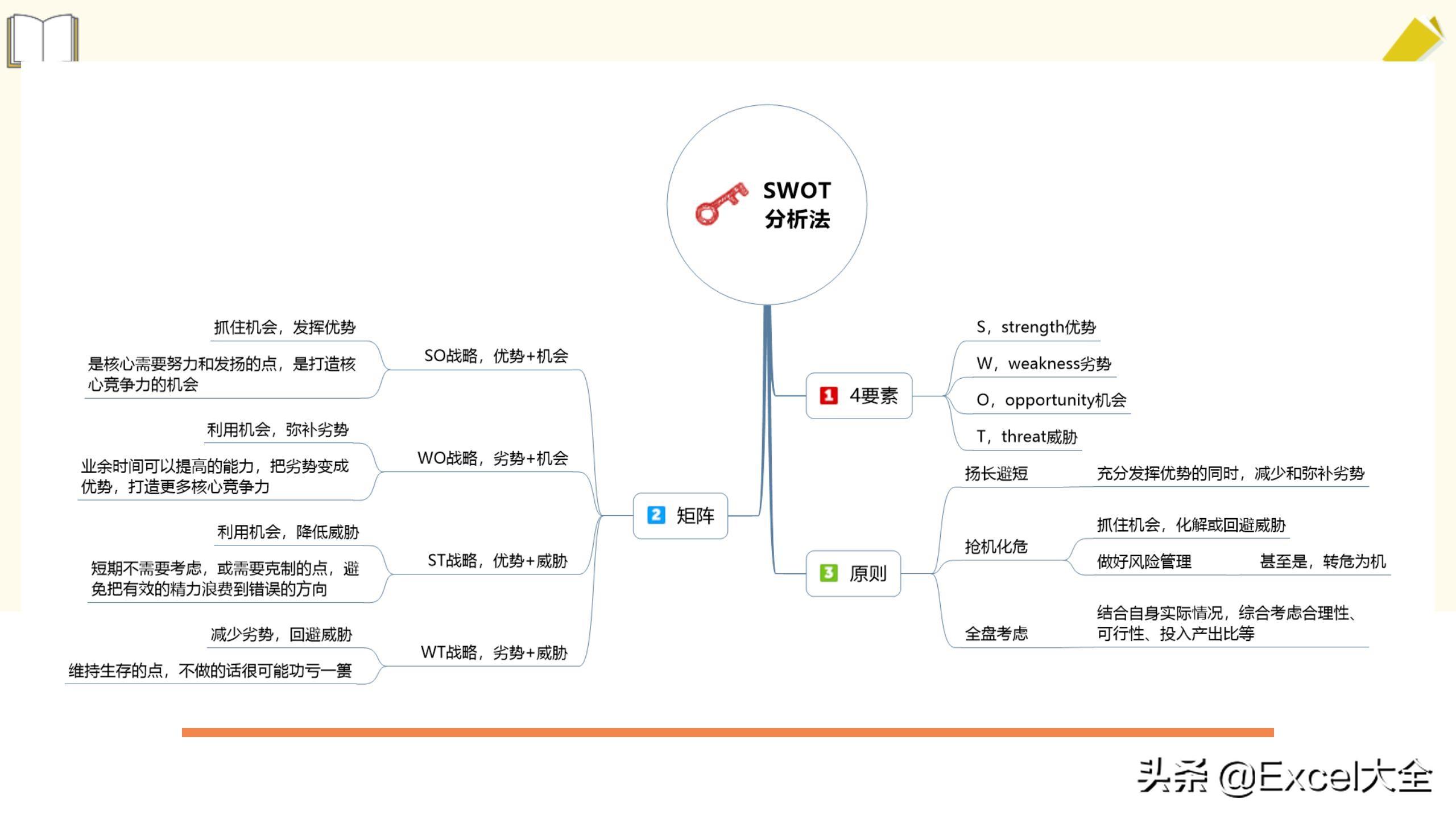 罗列出对象的因素(内部优劣势、外部机会威胁)梳理、筛选、结构化各因素,构建SWOT矩阵聚合分析内外部因素,综合评估得出结论:发展战略、计划(目标、行动方案)二、SWOT的4个要素、4种战略、3个原则