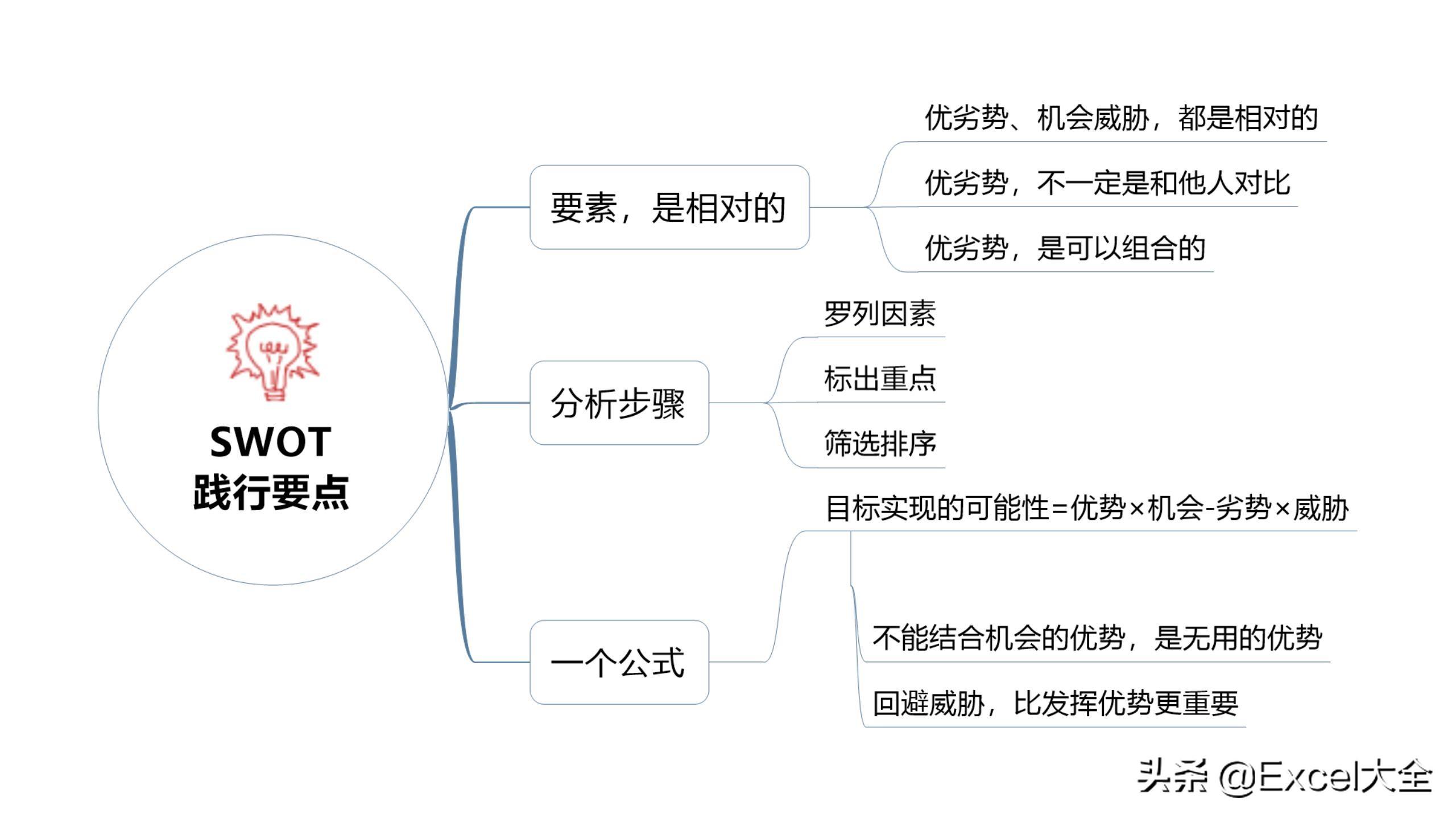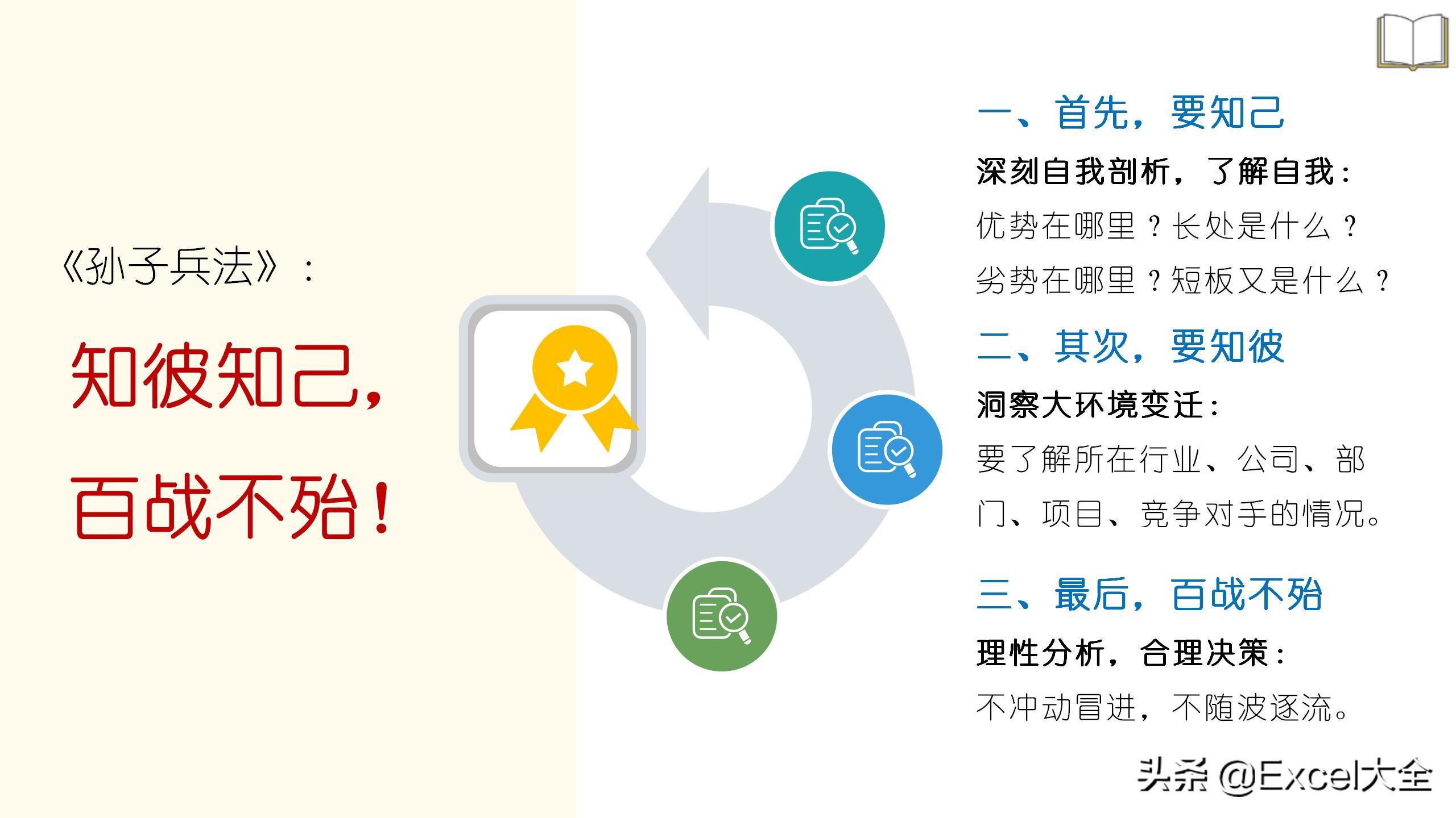 ①知己:深刻自我剖析,了解自我;②知彼:洞察大环境变迁;③百战不殆:理性分析,合理决策,不冲动冒进,不随波逐流。SWOT分析法,通过梳理、分析对象的内、外部因素,并对这些因素,进行聚合思考,从而得出战略结论的结构化分析方法: