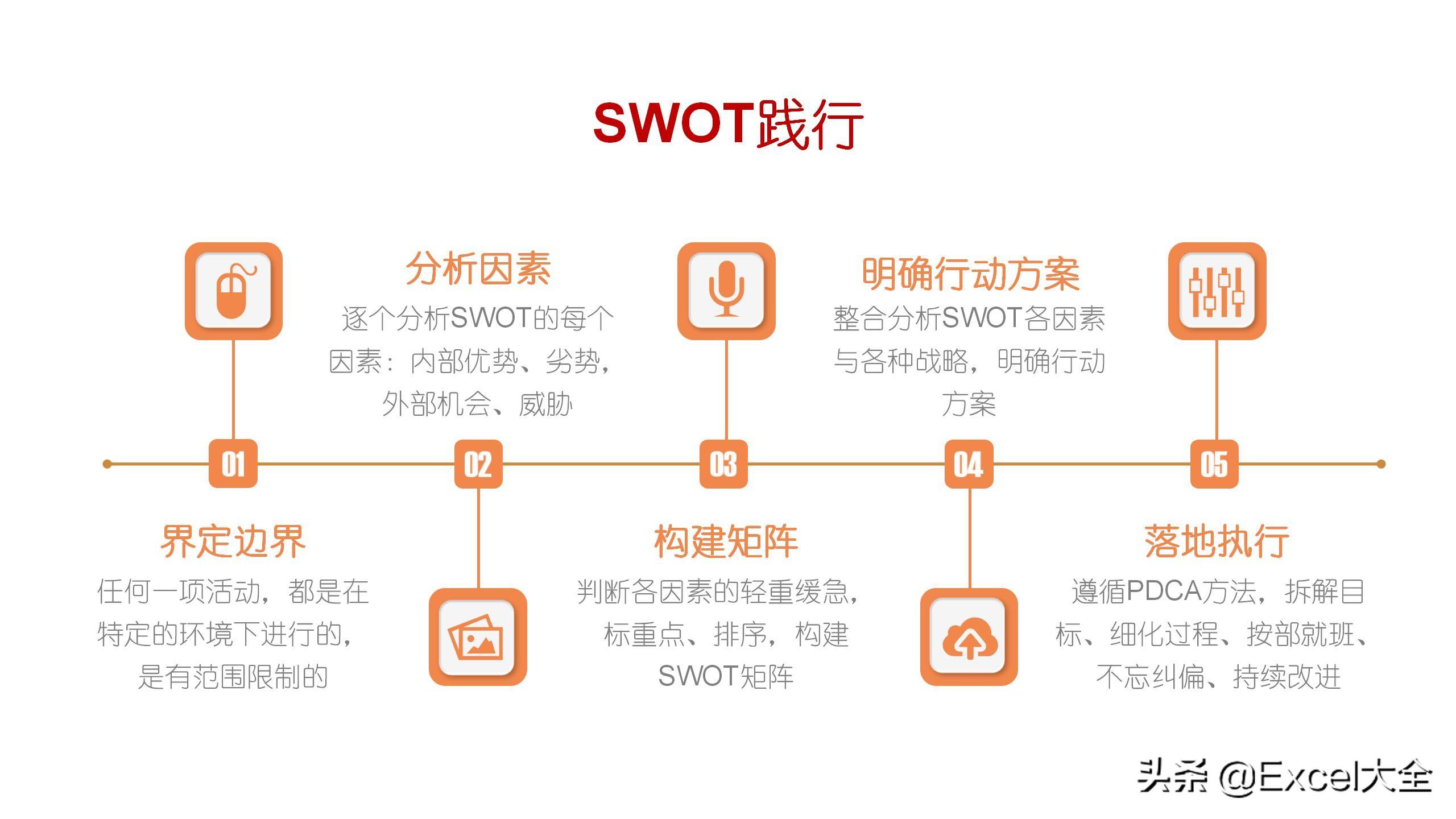 界定分析范围:任何一项活动,都是在特定的环境下进行的,也就是说,有范围的,有边界的;分析SWOT因素:逐步分析每个因素,优势、劣势、机会、威胁;构建矩阵:判断因素的轻重缓急,标出重点,并进行筛选和排序,构建SWOT矩阵,内外聚合,形成战略;明确行动方案:整合分析SWOT各因素,明确行动方案;落地执行:遵循PDCA方法,也就是计划-执行-检查-处理循环。四、践行要点