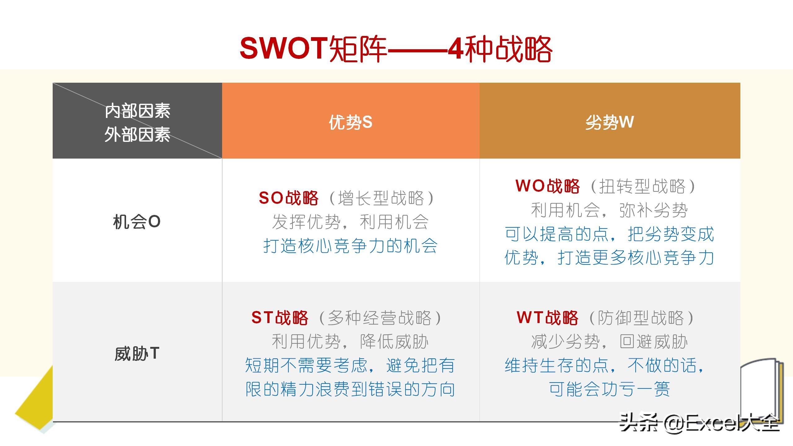 4种战略,就是SO战略(优势+机会)、WO战略(劣势+机会)、ST战略(优势+威胁)、WT战略(劣势+威胁);