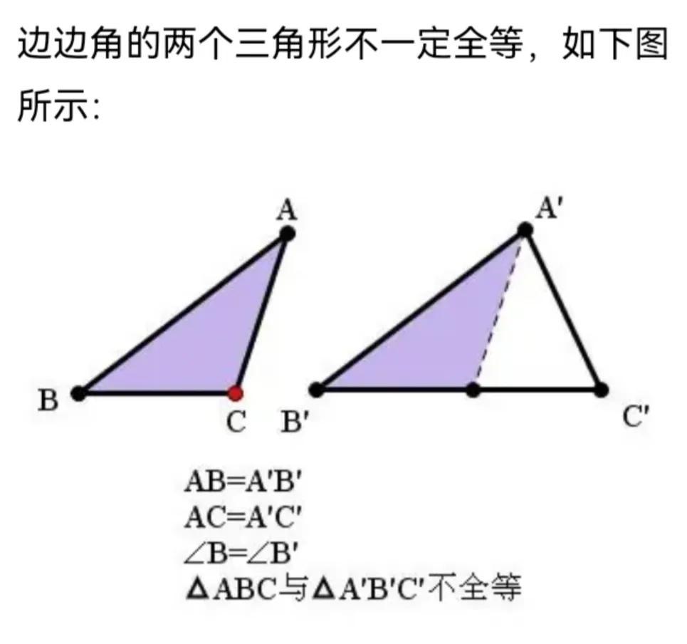 温馨提示全等三角形的判定没有边边角,也没有角角角。边边角无法确定三角形全等,根源于圆与直线可以有两个交点,或者说是作图原理决定了边边角不能证明三角形全等.