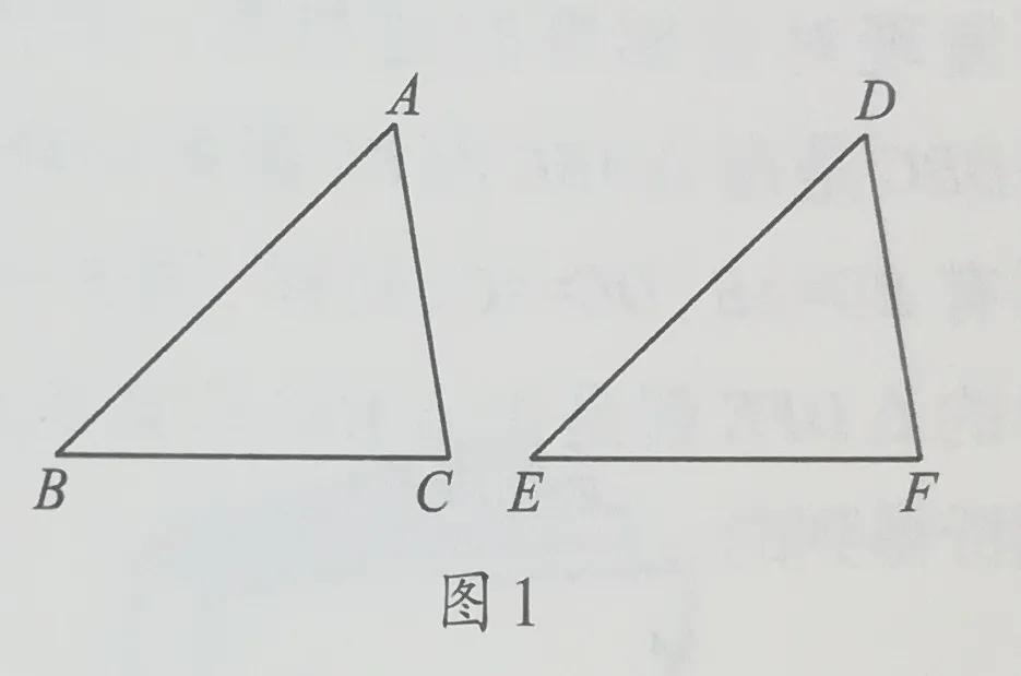 我和我的同胞有特殊的语言。我是△ABC ,若 △DEF 与我全等,我们可以表示为△ ABC≌△DEF (如图1)。一旦我们使用了语言“≌”,就说明我们的对应关系确定了:一是顶点对应,点 A 与点 D 、点B与点 E 、点 C 与点 F 对应;二是边与边对应, AB 与 DE 、 BC 与 EF 、 AC 与 DF 对应。但如果我们表示成“△ABC 与△DEF 全等”,那么我们的对应关系就是不确定的。
