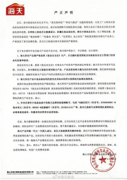 针对在事件中恶意造谣中伤海天品牌的短视频账号,海天味业已委派专业律师团队调查取证,必将恶意造谣者、传播者的法律责任追查到底。