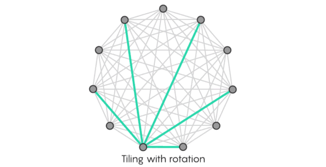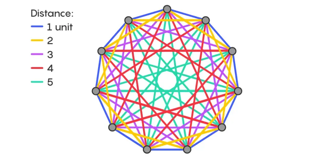 如何进行颜色编码呢?首先,想象围绕一个圆排列的11个点的完整图,编码规则是根据距离(通过一条边连接的两个点之间的距离)进行上色。