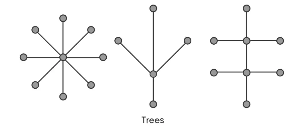 接下来,我们看一下另一种类型的图。它可以是一条简单的路径;也可以有其他分支,当然我们还可以在分支上继续添加分支,只要它不包含任何闭环,就可以根据需要使图更复杂,我们把这种类型的图称为树。