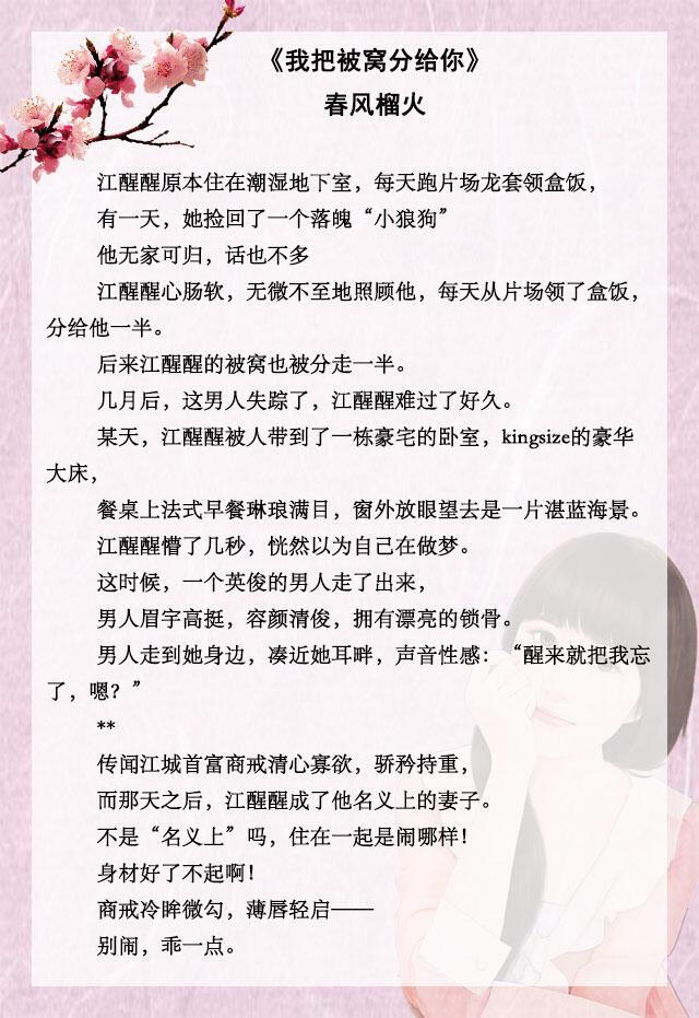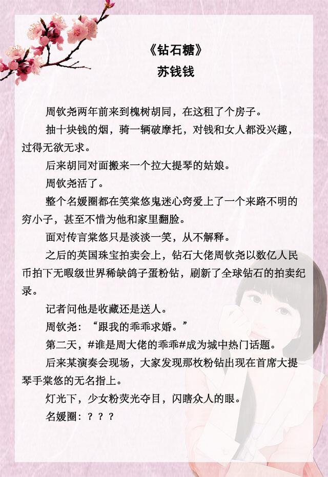 短评:治愈系小甜文,男主有钱有颜、深情专一,因为家庭变故背井离乡,在胡同里租房住,独来独往,前期被误认为是普通人,后来才知道他是钻石大佬。女主性格讨喜,温柔大方,不矫情不做作,该打脸时一点也不怂。