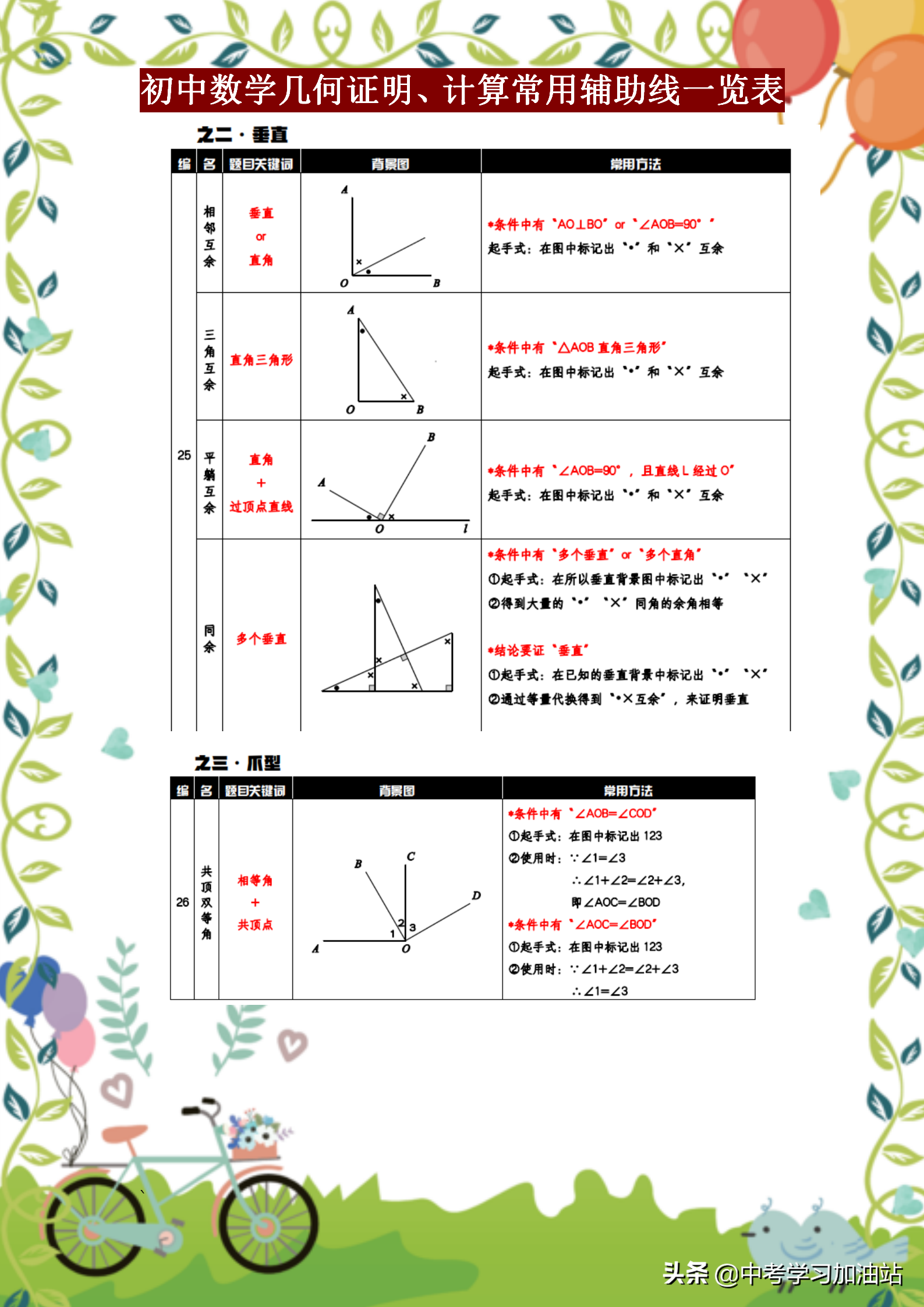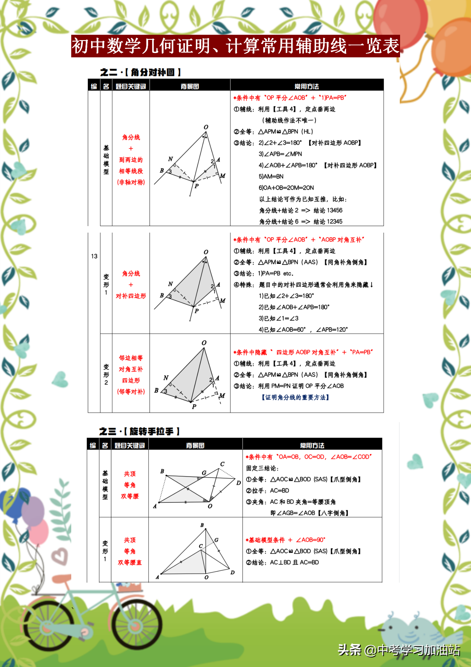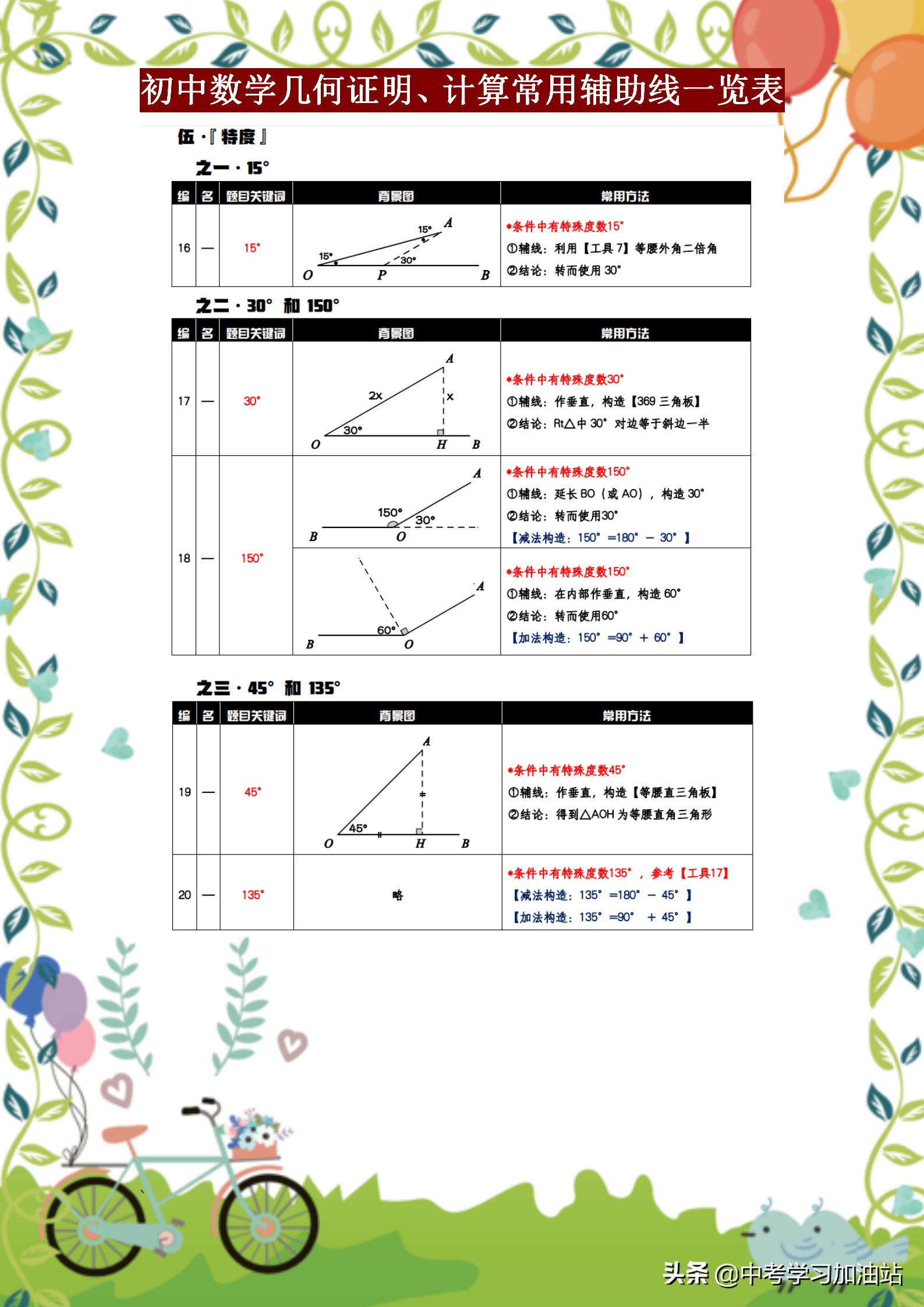 所以我们在学习几何的时候,一定要多留心辅助线,只要掌握每种图形的几何辅助线的作法,计算的证明和计算就相当的简单。在此,也是给大家分享一份30年老教师经验总结:搞定这些辅助线,轻松搞定初中数学几何证明。希望大家能够吃透!