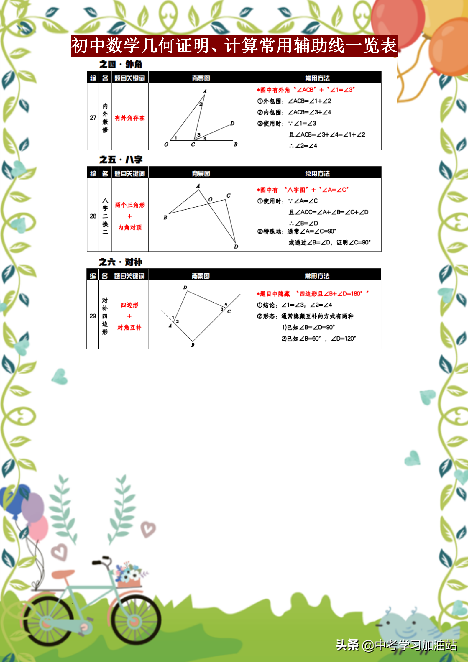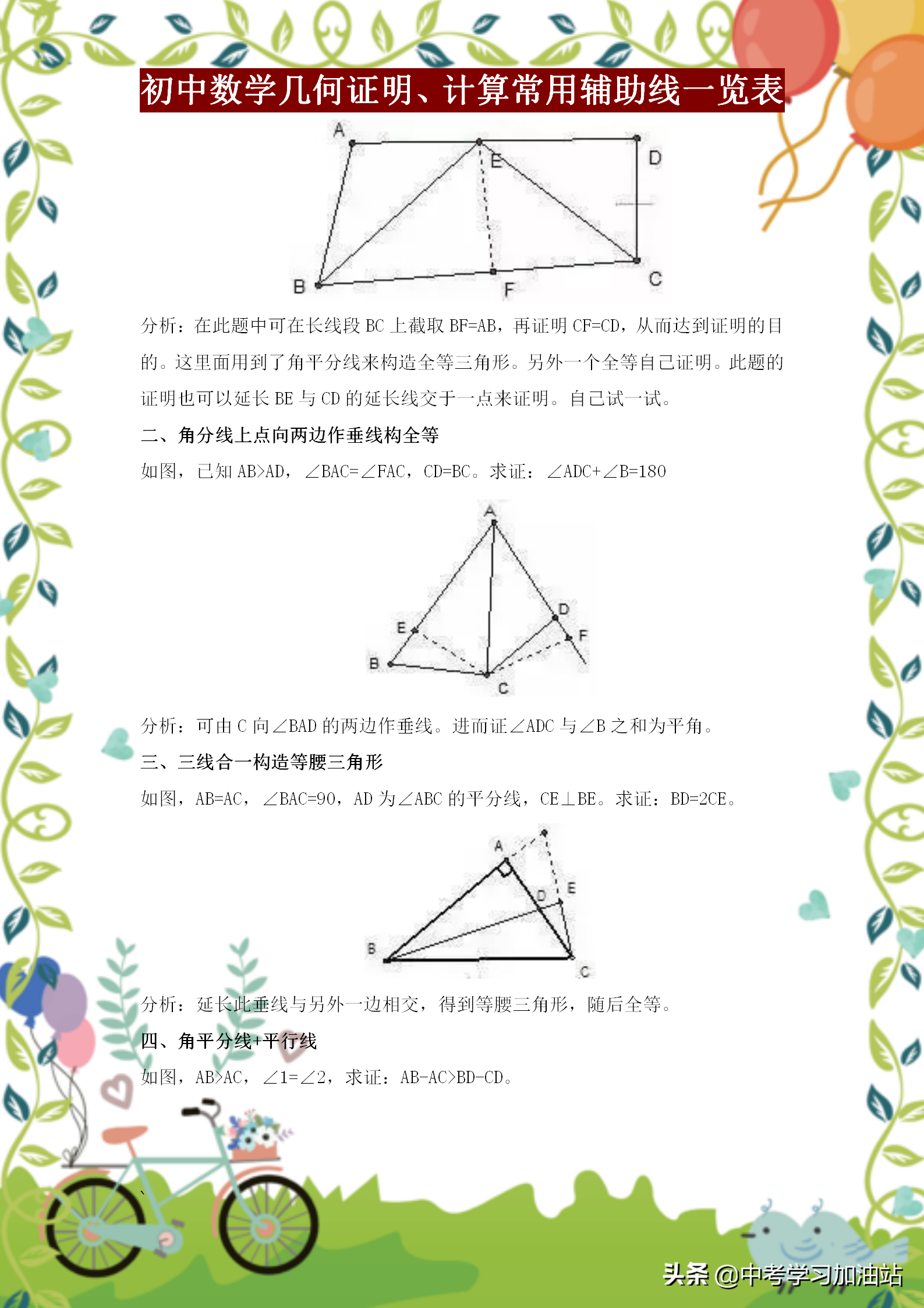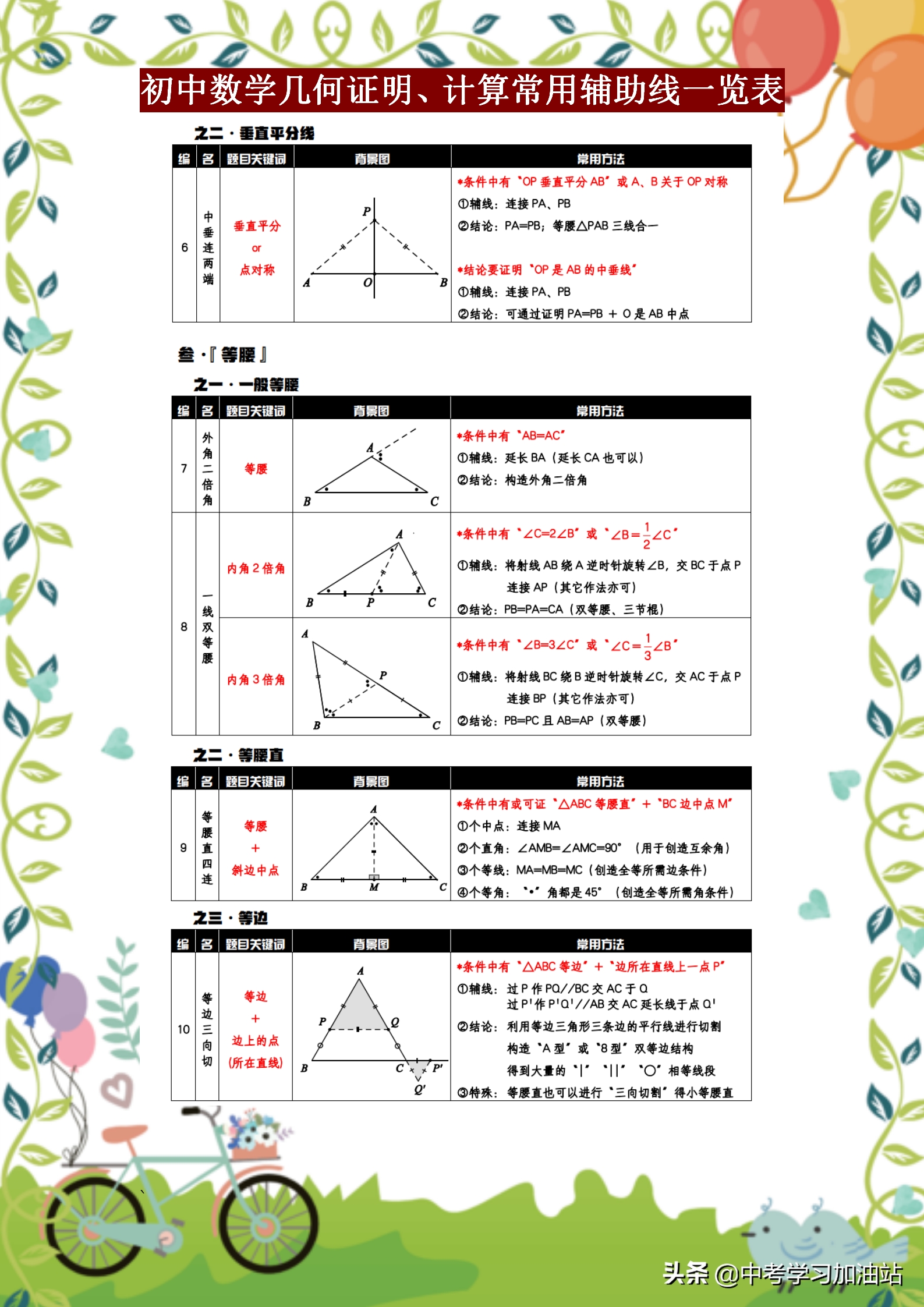 所以我们在学习几何的时候,一定要多留心辅助线,只要掌握每种图形的几何辅助线的作法,计算的证明和计算就相当的简单。在此,也是给大家分享一份30年老教师经验总结:搞定这些辅助线,轻松搞定初中数学几何证明。希望大家能够吃透!