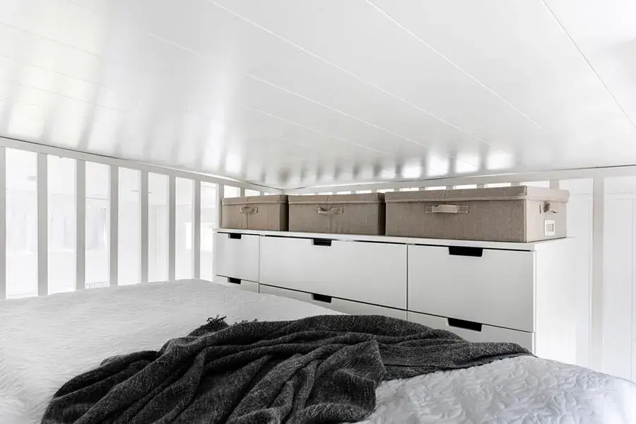 特别将床头安排高位处,而床尾处则另安装斗柜,增加收纳。