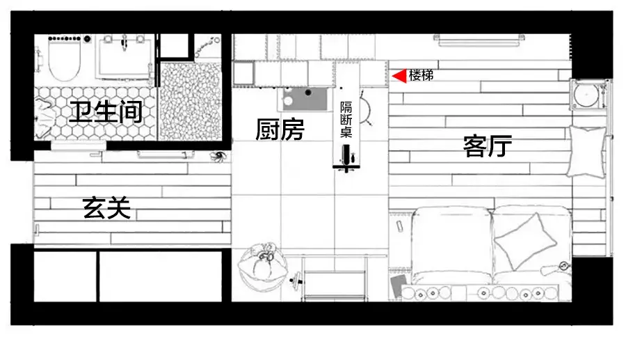 为这套小宅多挣得一些面积打造卧室,并进而创造公、私分明的场域效果。
