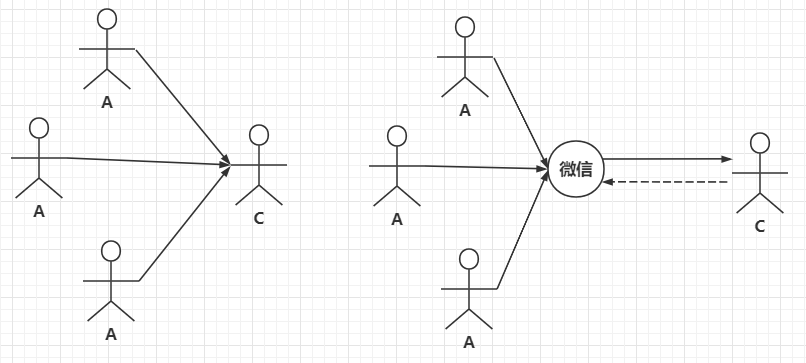 当然这样看来并没有增加A与C通信的效率,反而多了一层代理,但是,当A多了以后呢?