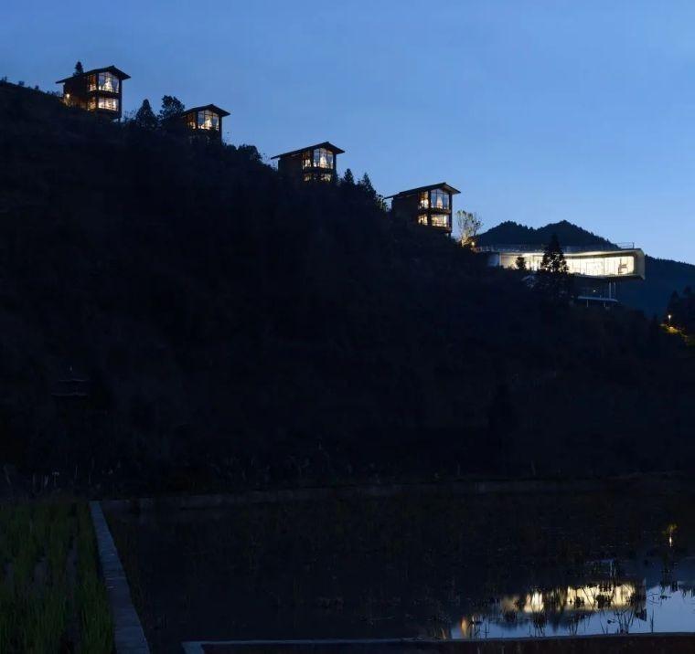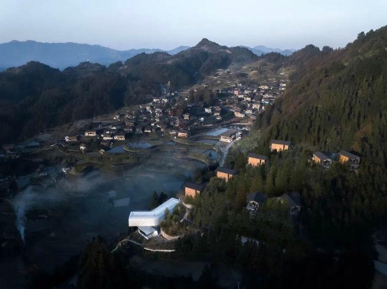 该项目建筑面积2400㎡,包括1650㎡的增量建筑置入和750㎡的存量建筑改造,其中增量部分由8幢单体客房及餐厅、悬崖剧场、无边泳池等公区配套组成,配以登山步道建设及局部景观修复,以此带动整个村落的生活生产动线以及未来发展的文旅产业流线